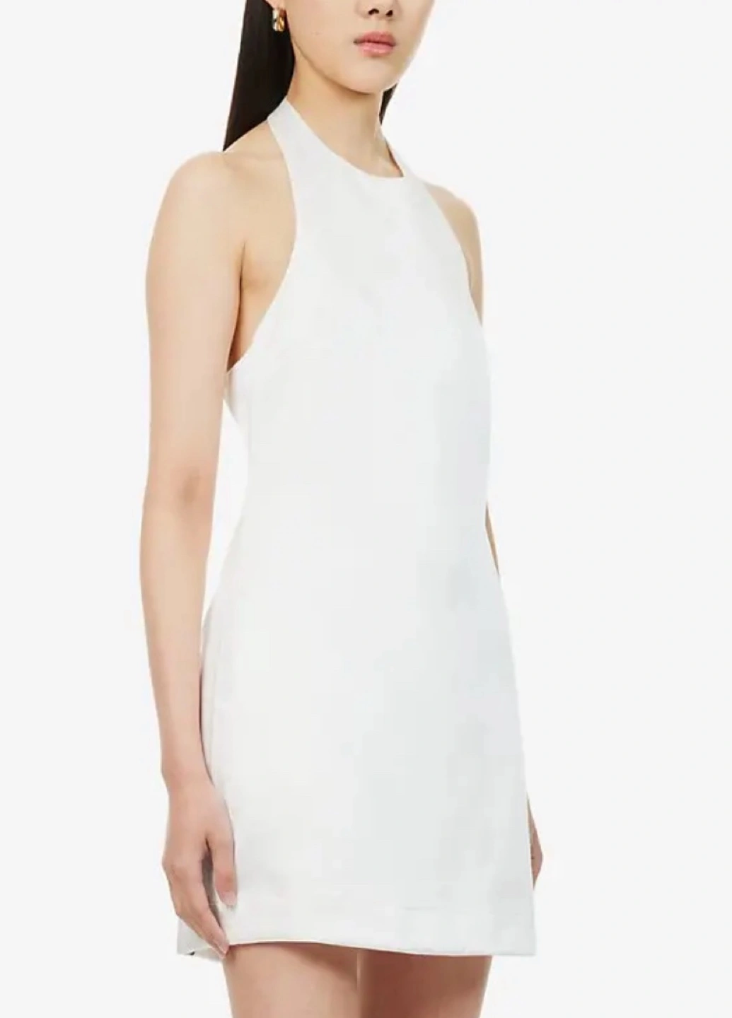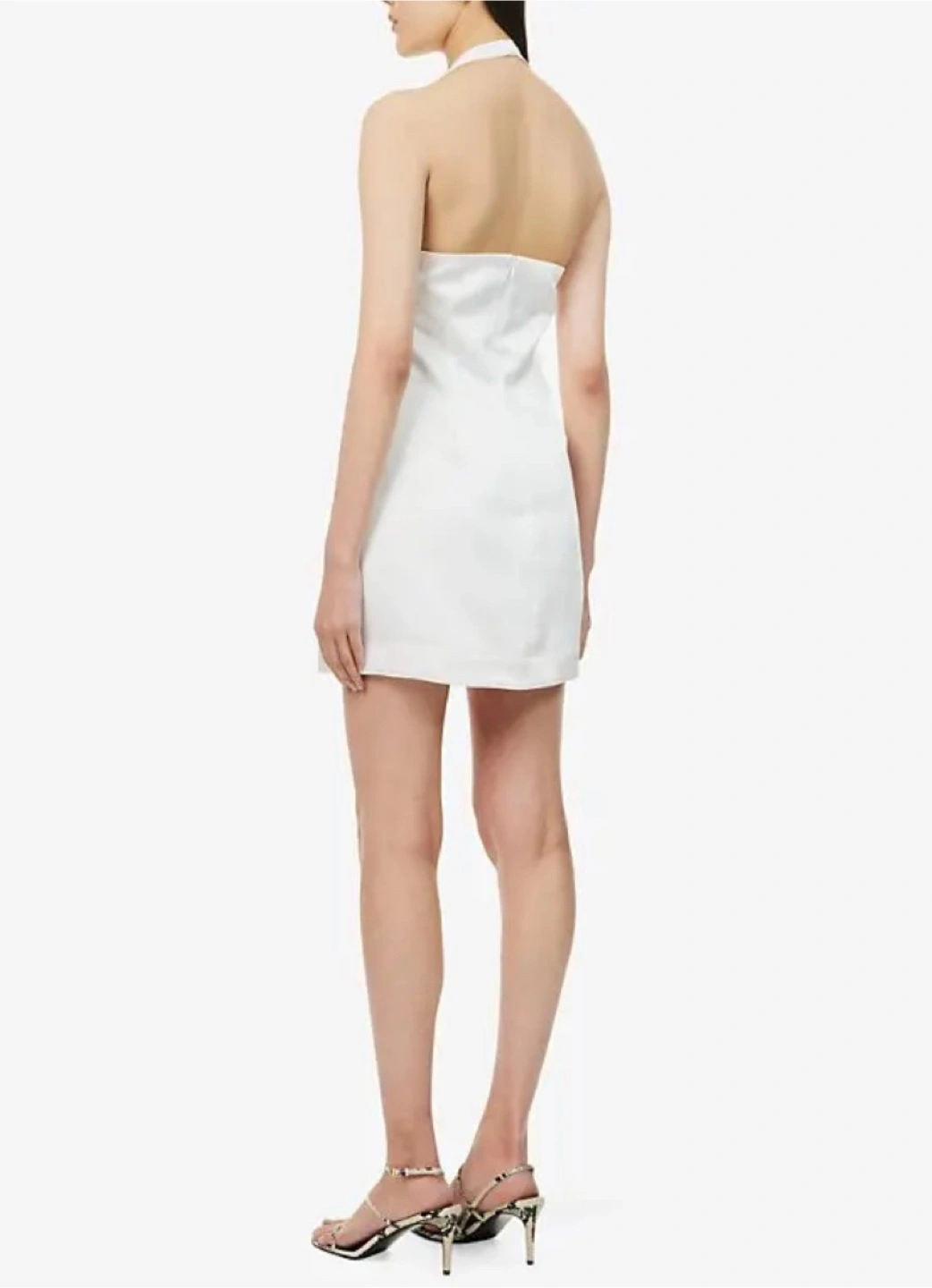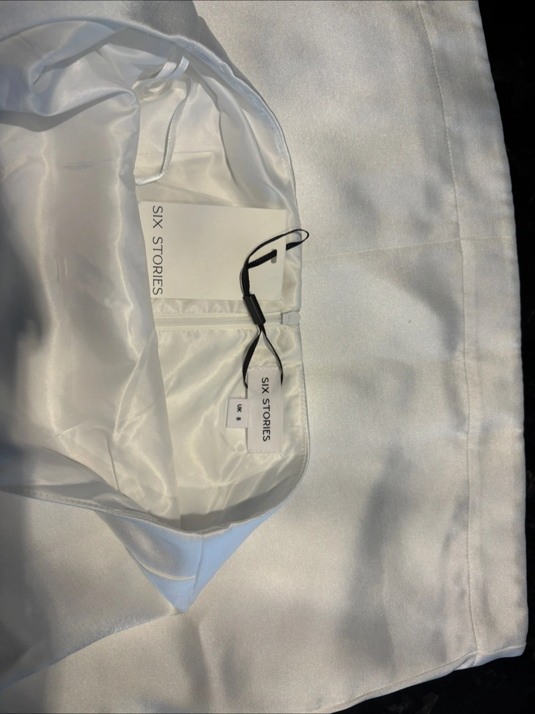 399Six Stories satin mini dress crafted from 100% satin. Featuring a concealed zip fastening, a regular fit, a halterneck, sleeveless, darts at the chest, an open back, and a lined design. The mini dress is machine washable in cold water. It is true to size and has a length of 34 inches or 86 centimeters. The dress has a regular fit and is made from lightweight, non-stretch satin. Size UK 8/US 4 with tags Perfect engagement, bridal or bachelorette attire