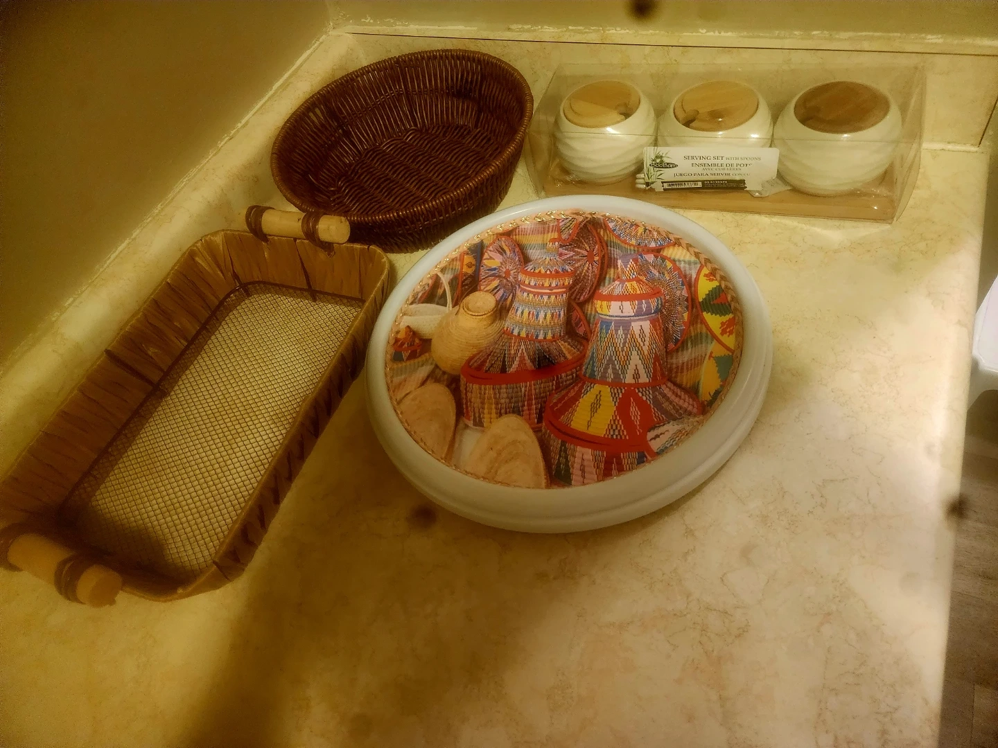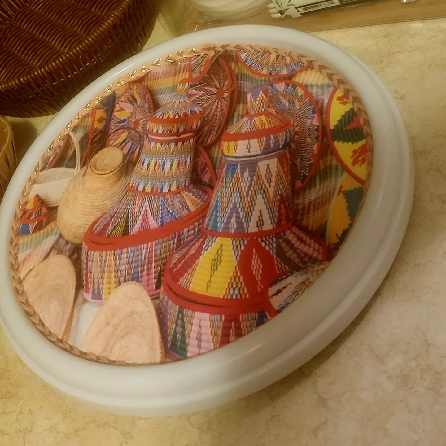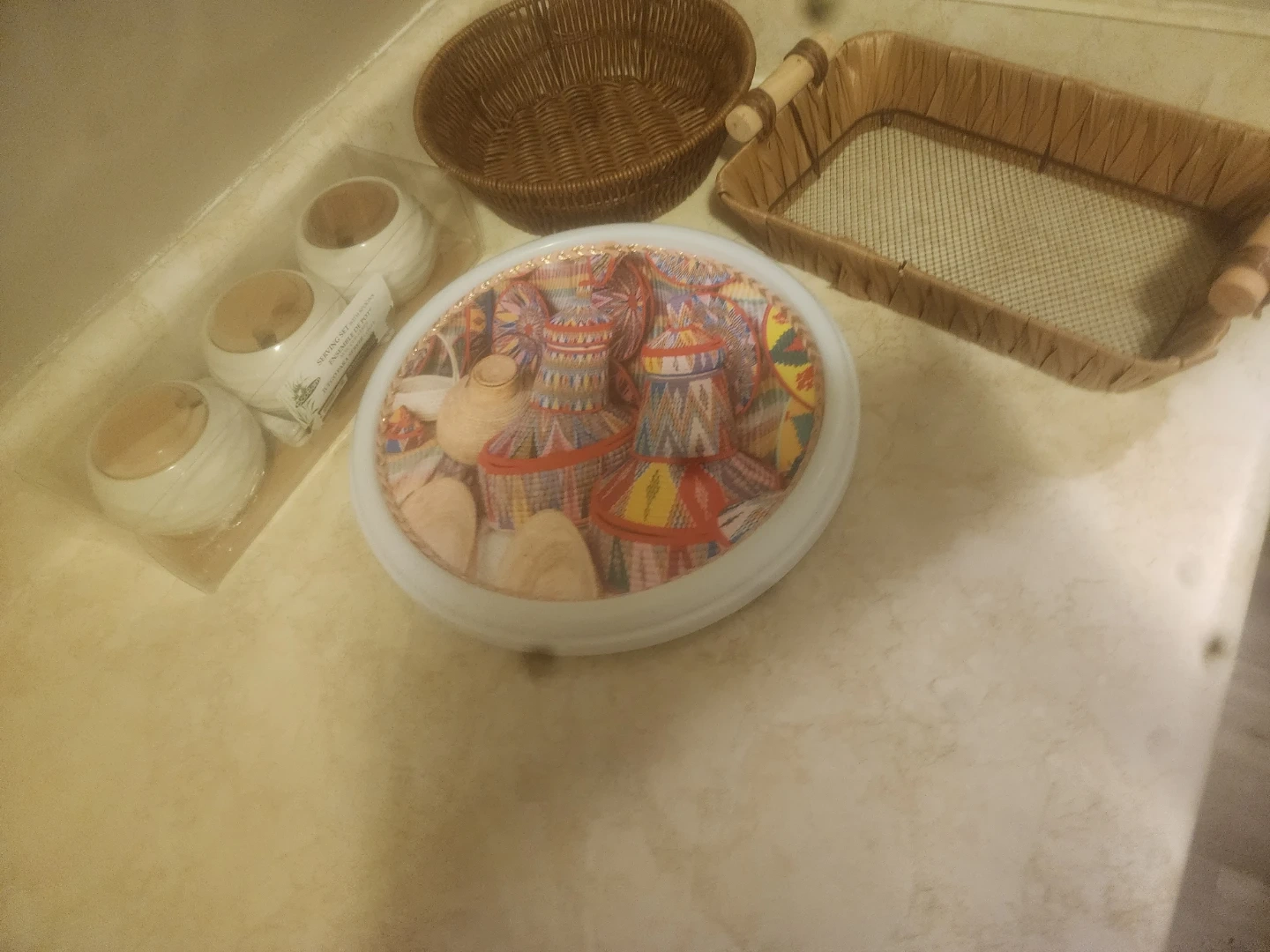 Selling a decorative plate with a colourful design and a couple of baskets. They would be great for adding a touch of warmth to any room in your home