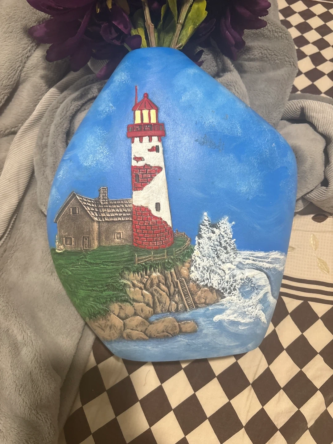 Selling a unique, hand-painted clay vase featuring a detailed lighthouse scene. It's a charming piece of art that would look great as a decorative item in your home