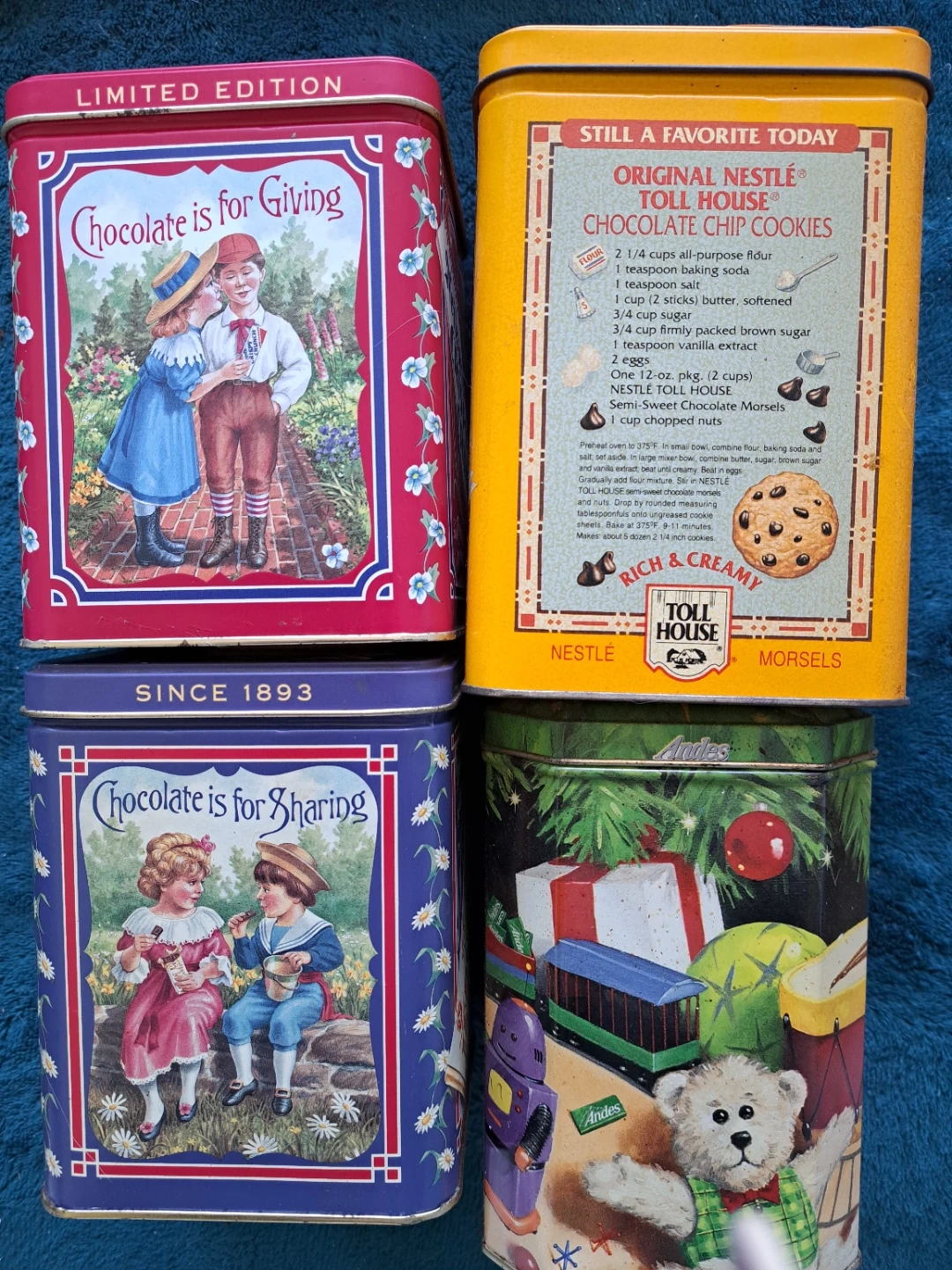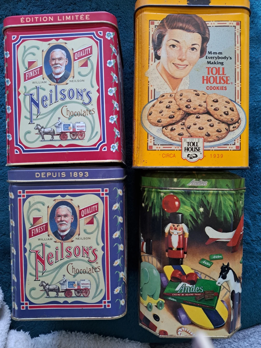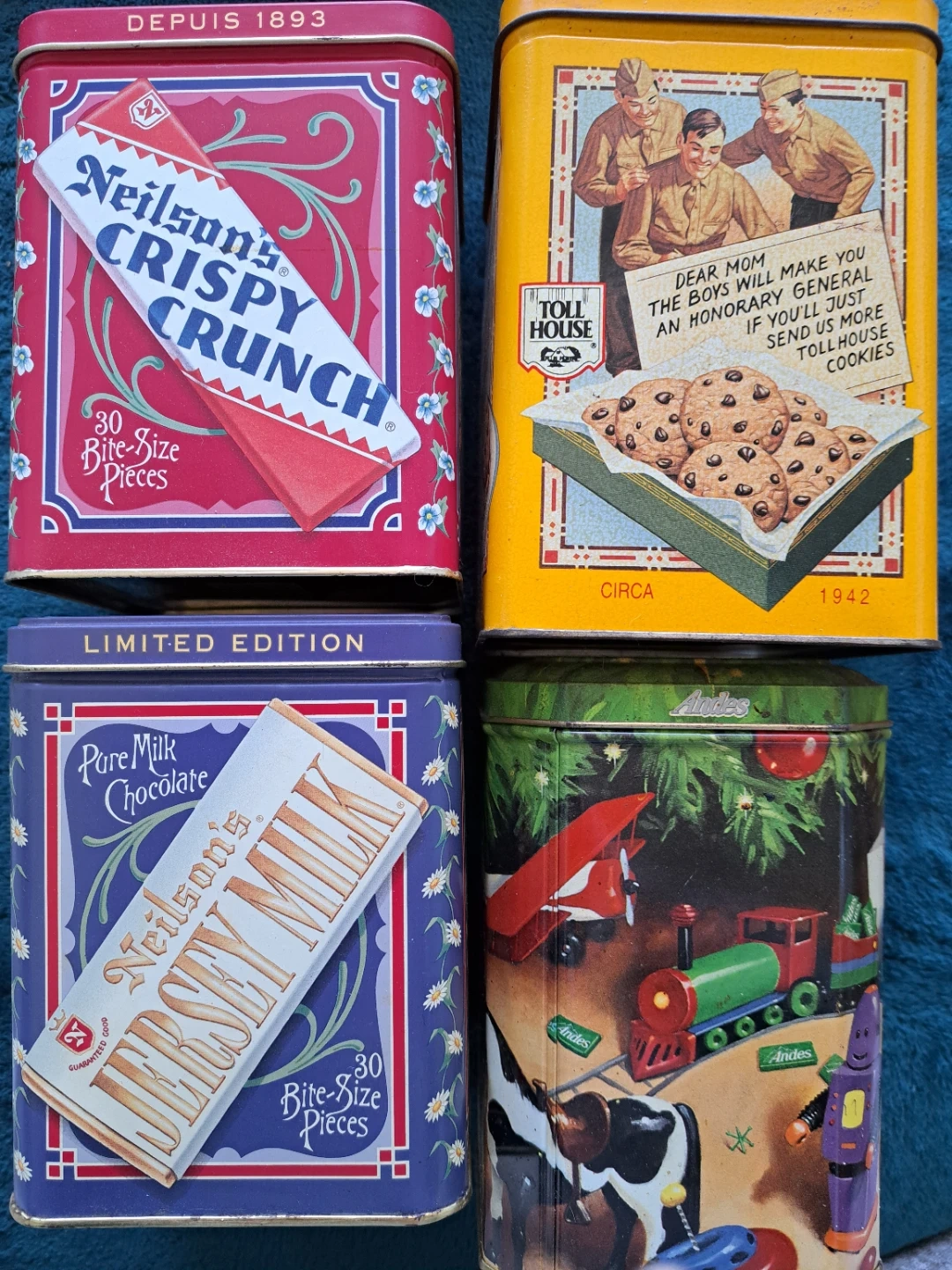 This lot includes four collectible tin boxes. Two feature Neilson's Chocolates designs, one is for Toll House Cookies with a recipe, and the last one has an Andes design with a Christmas theme. They're great for display or storage! From approx. 1994!