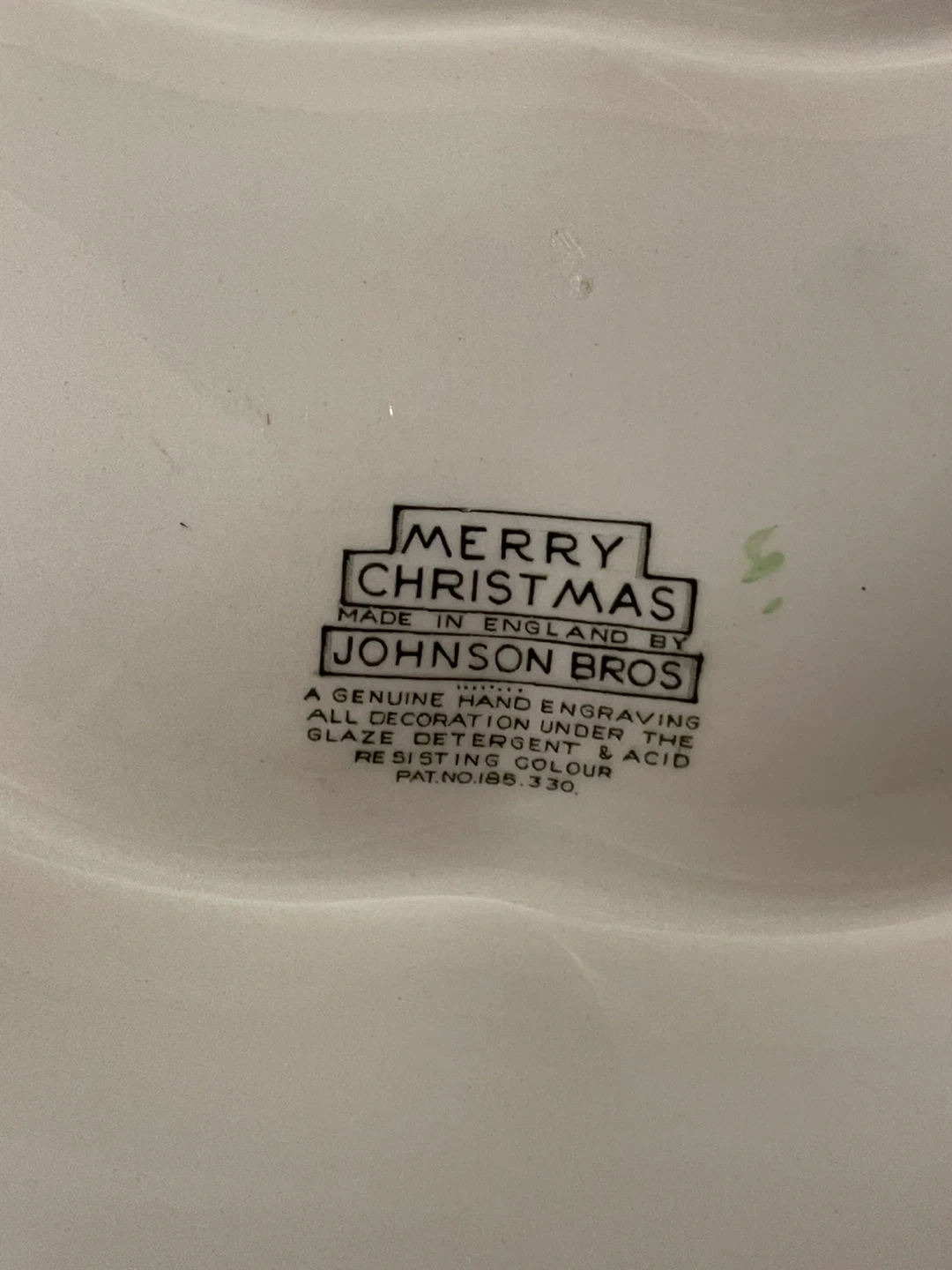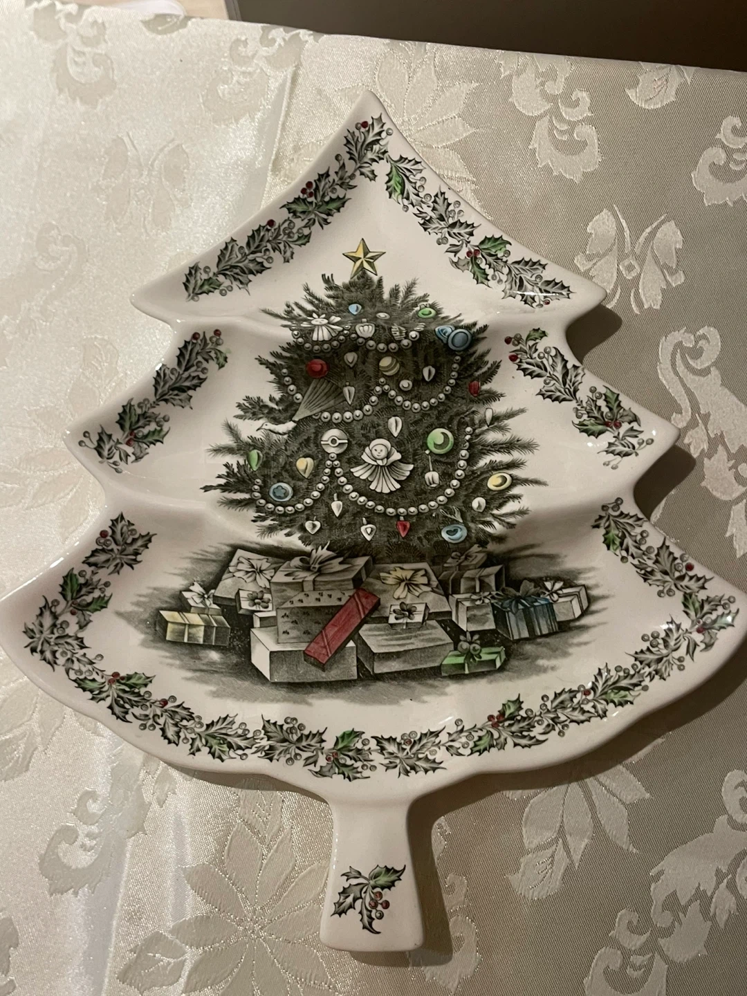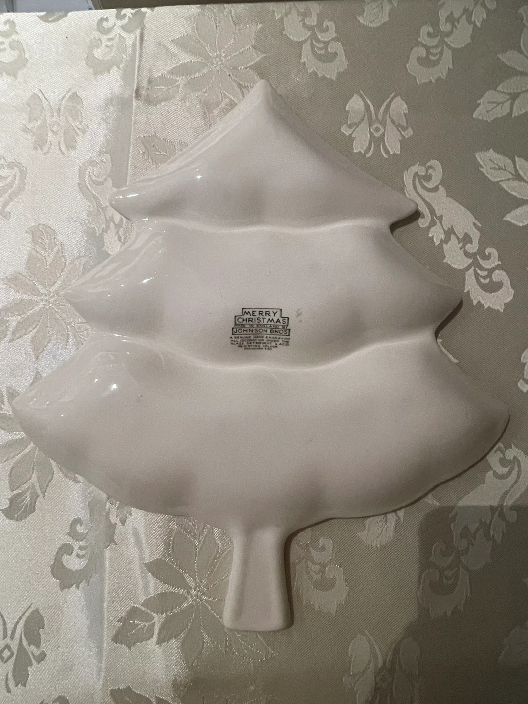 Selling a lovely Johnson Bros 'Merry Christmas' tree-shaped plate! It's made in England and features a genuine hand engraving with decoration under the glaze. It's detergent and acid resistant in colour. A perfect addition to your holiday decor! Size 14 inches tall - 12 inch wide. Ready to be a gift ๐