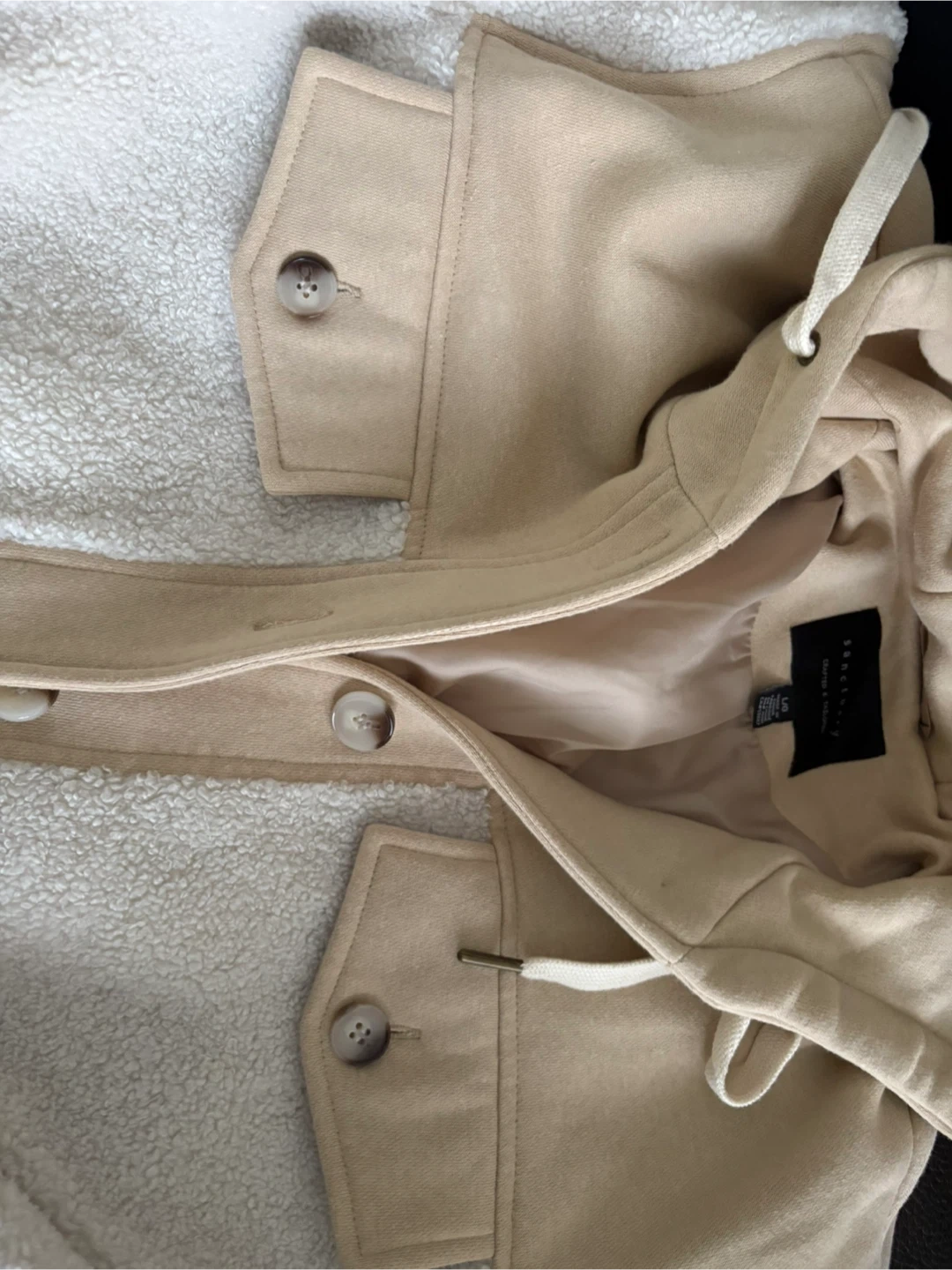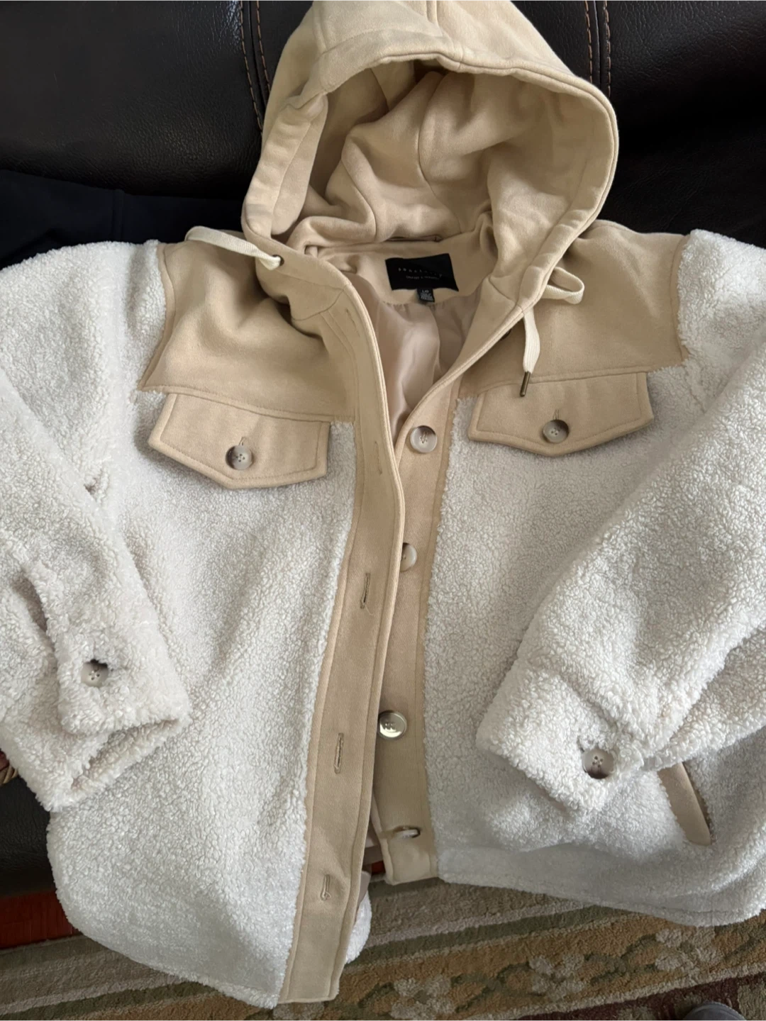 Cozy up in this stylish Sanctuary sherpa jacket. It's a cream and tan colour, and has a button-up front and two chest pockets. Perfect for cooler weather! Brand new - never worn