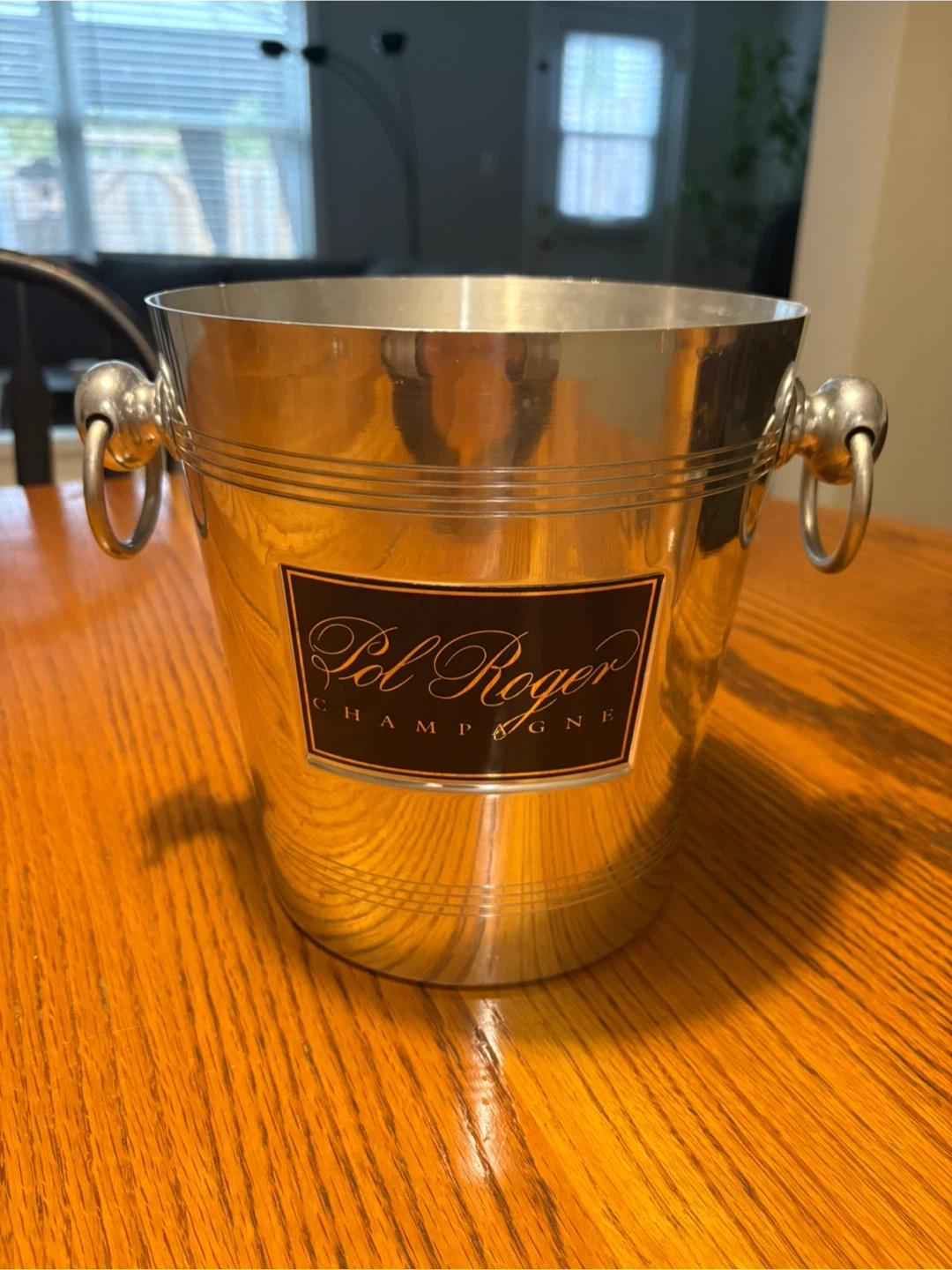 A classic Pol Roger champagne ice bucket with side handles. Made in France. It's made of metal with a silver-tone finish. This bucket is great for keeping your champagne chilled at parties or special occasions!