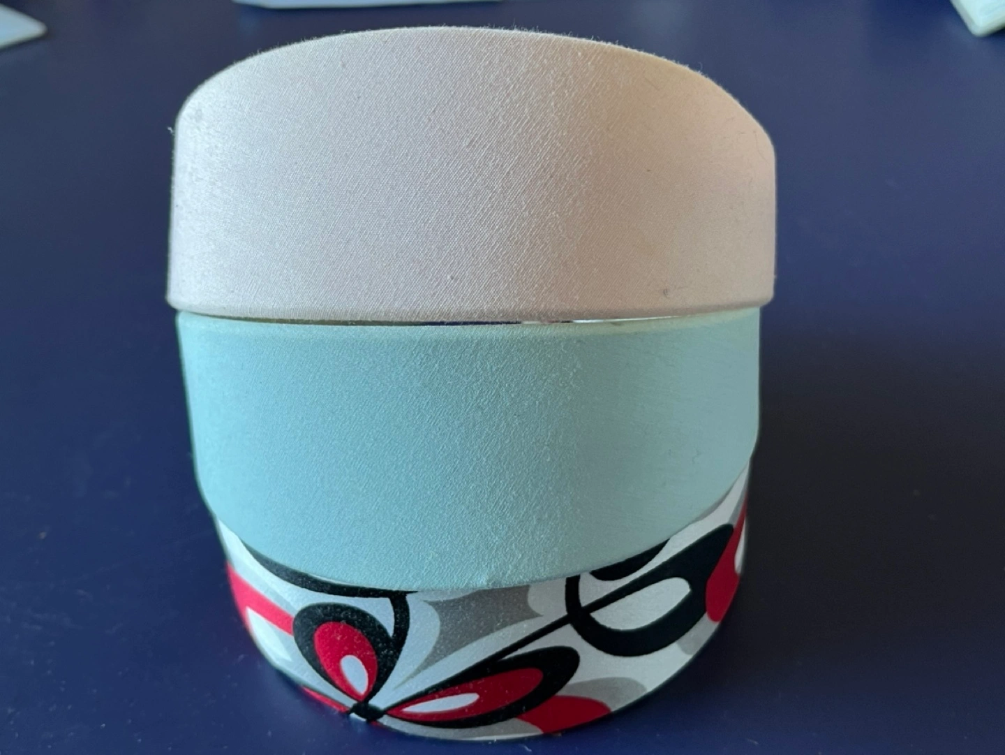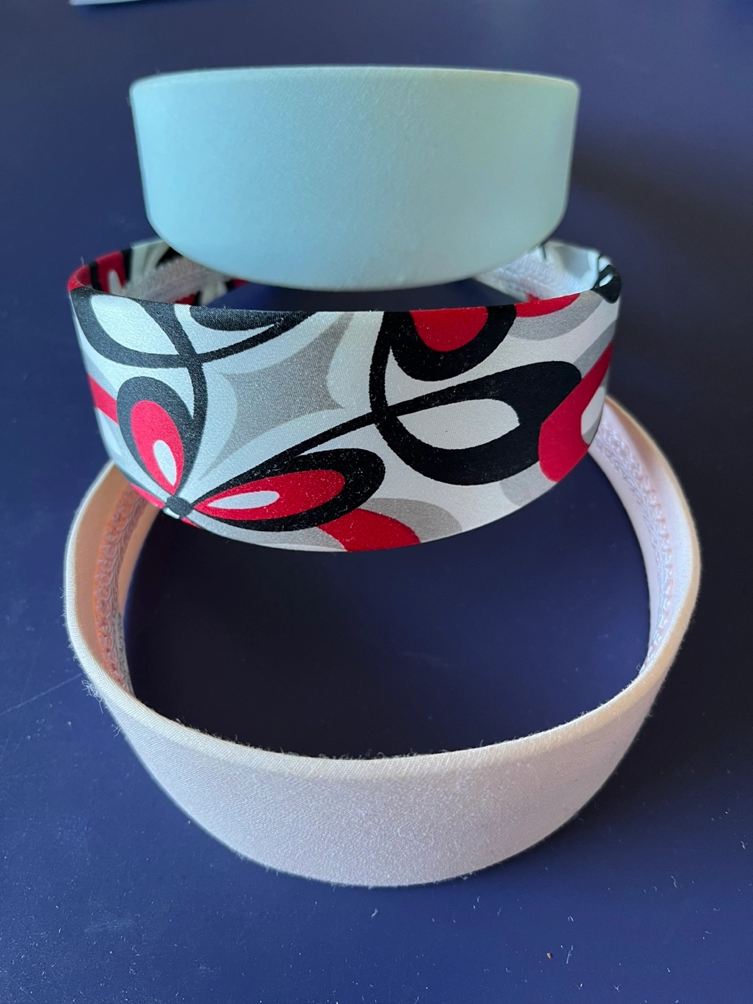 Set of 3 headbands. One plain pink, one plain blue, one patterned with red, grey, and black. All fabric. Very good condition.