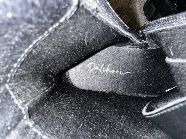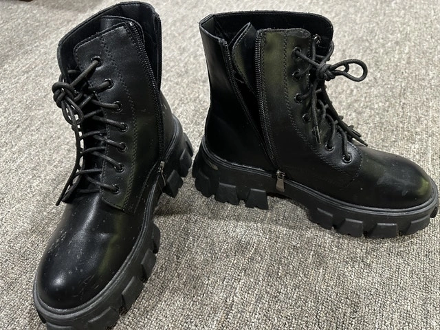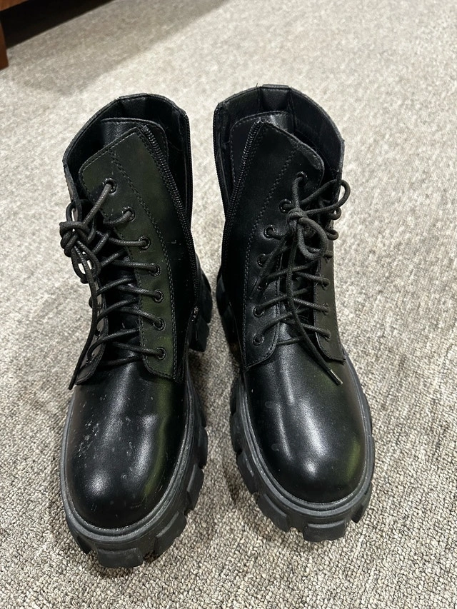 These are Dalshoes black combat boots with a lace-up front and chunky lug sole, perfect for adding an edgy touch to your wardrobe. These boots are in used condition, showing some signs of wear, as you can see in the pictures. Features: * Lace-up closure with side zipper * Chunky lug sole for added traction * Size 37 (approximately US 7) I think a fair price for these boots is $40. If the ad is up, the item is available!