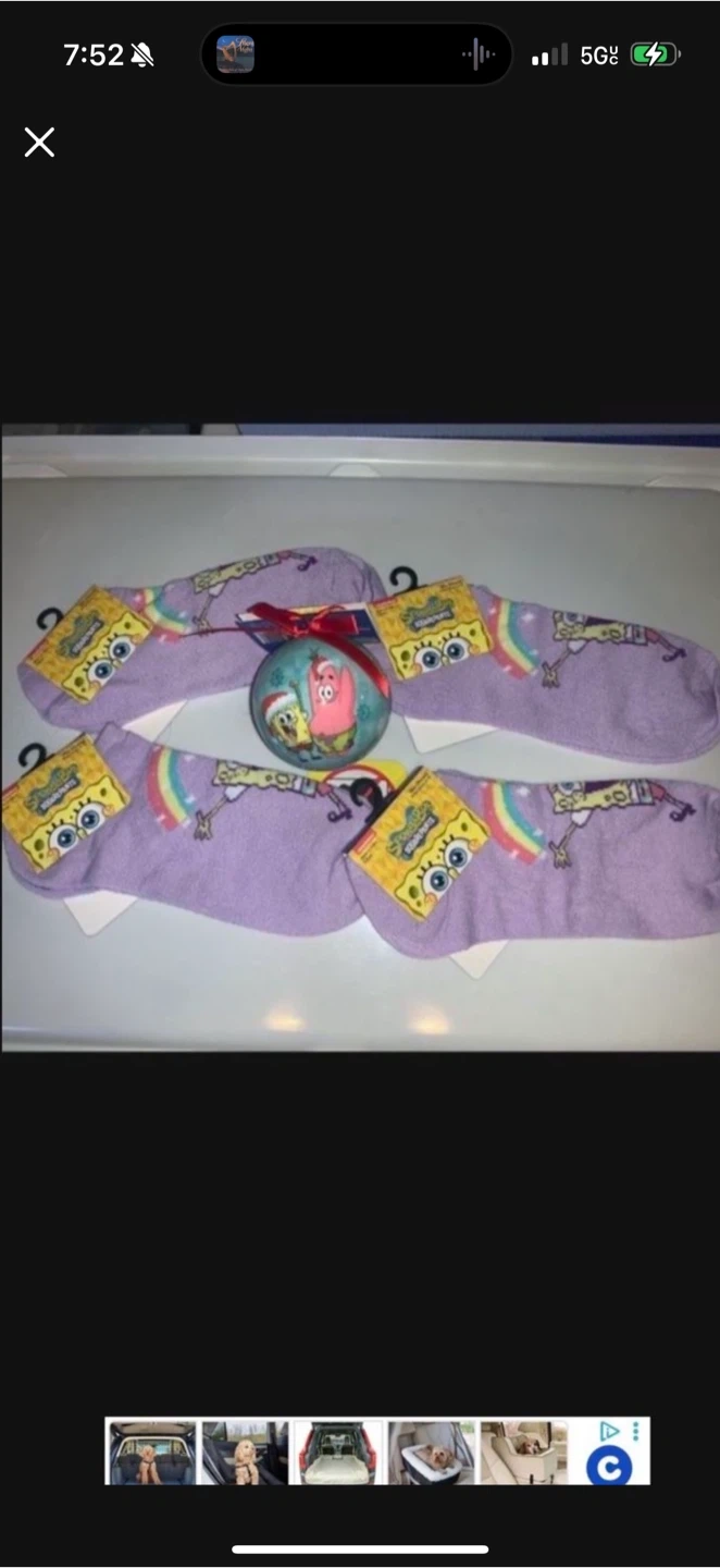 Cute Spongebob socks and a matching ornament! The socks are a fun lavender color with Spongebob and rainbow details. Perfect for a Spongebob fan!