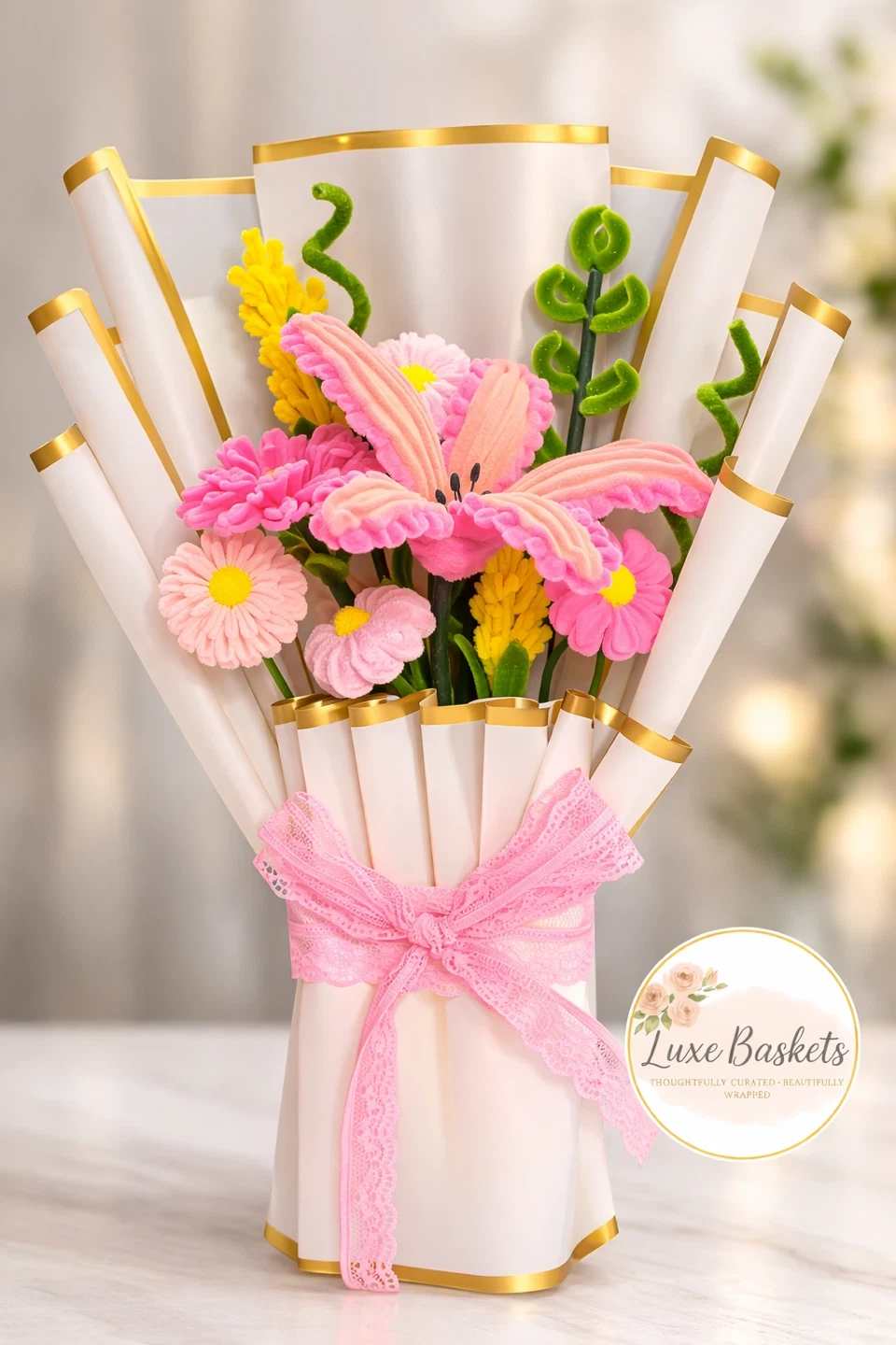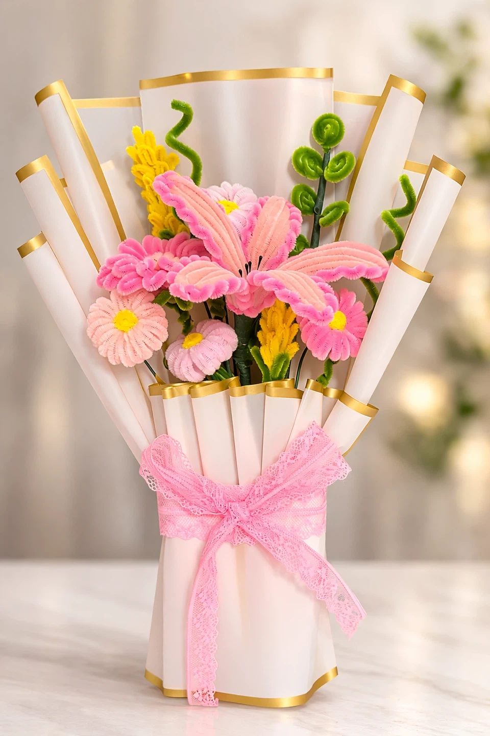 A delightful handmade bouquet featuring pink flowers crafted from pipe cleaners. It's elegantly wrapped in white paper with gold trim and tied with a lace bow. This arrangement's vibrant colours make it a cheerful decoration for any space.