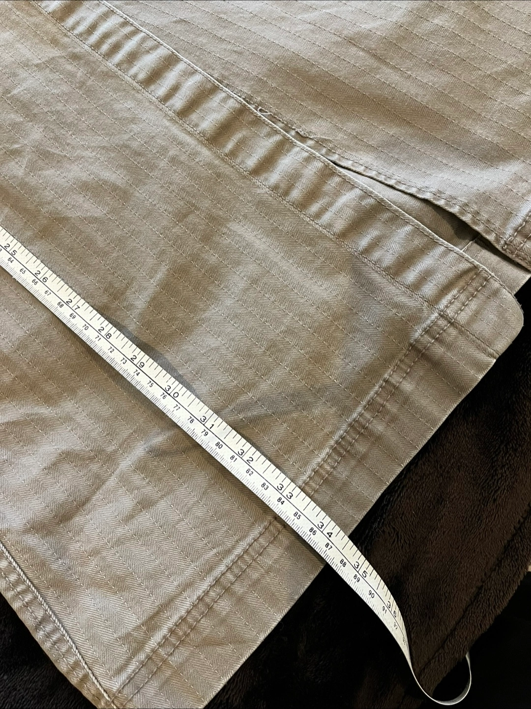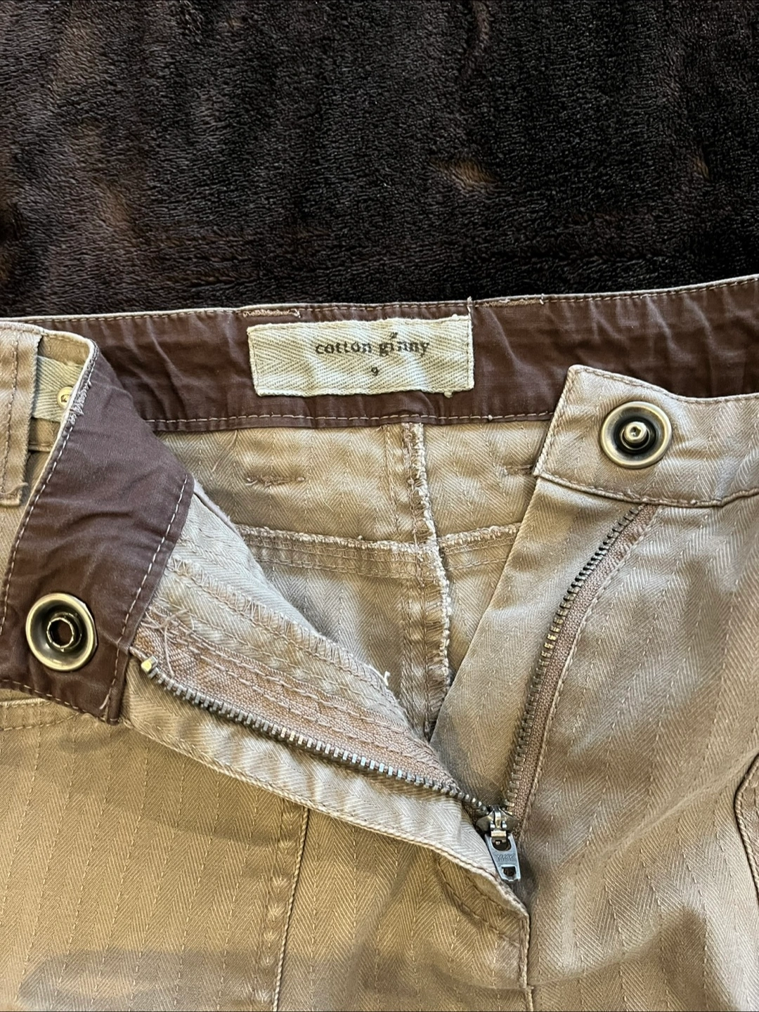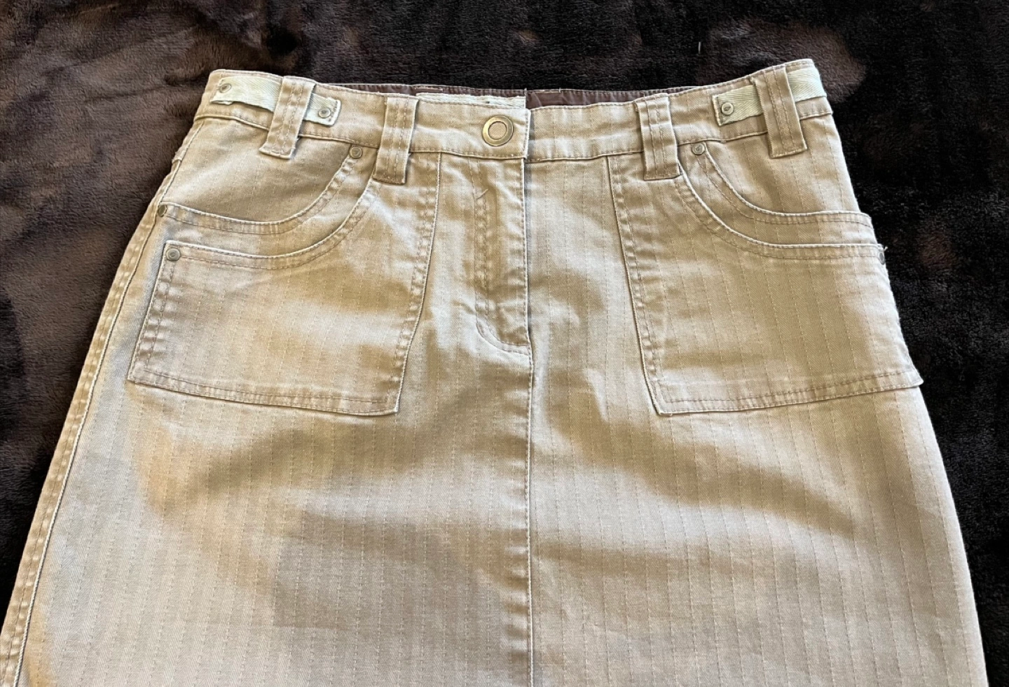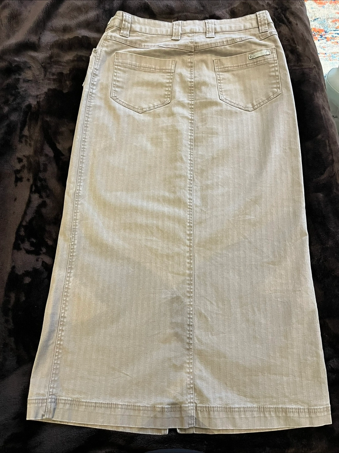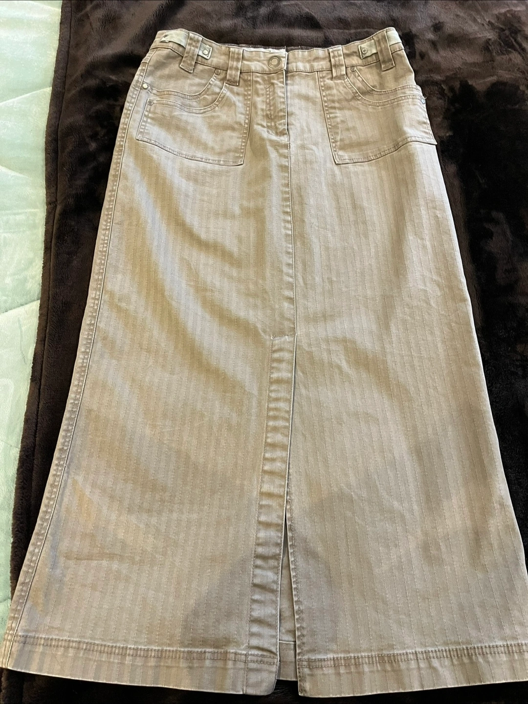 Cotton Ginny long denim skirt, light brown colour with nice texture, close up shown in picture. In good condition, no damage. Size 9. It’s approximately 34” in length with a 15” high split at the front.