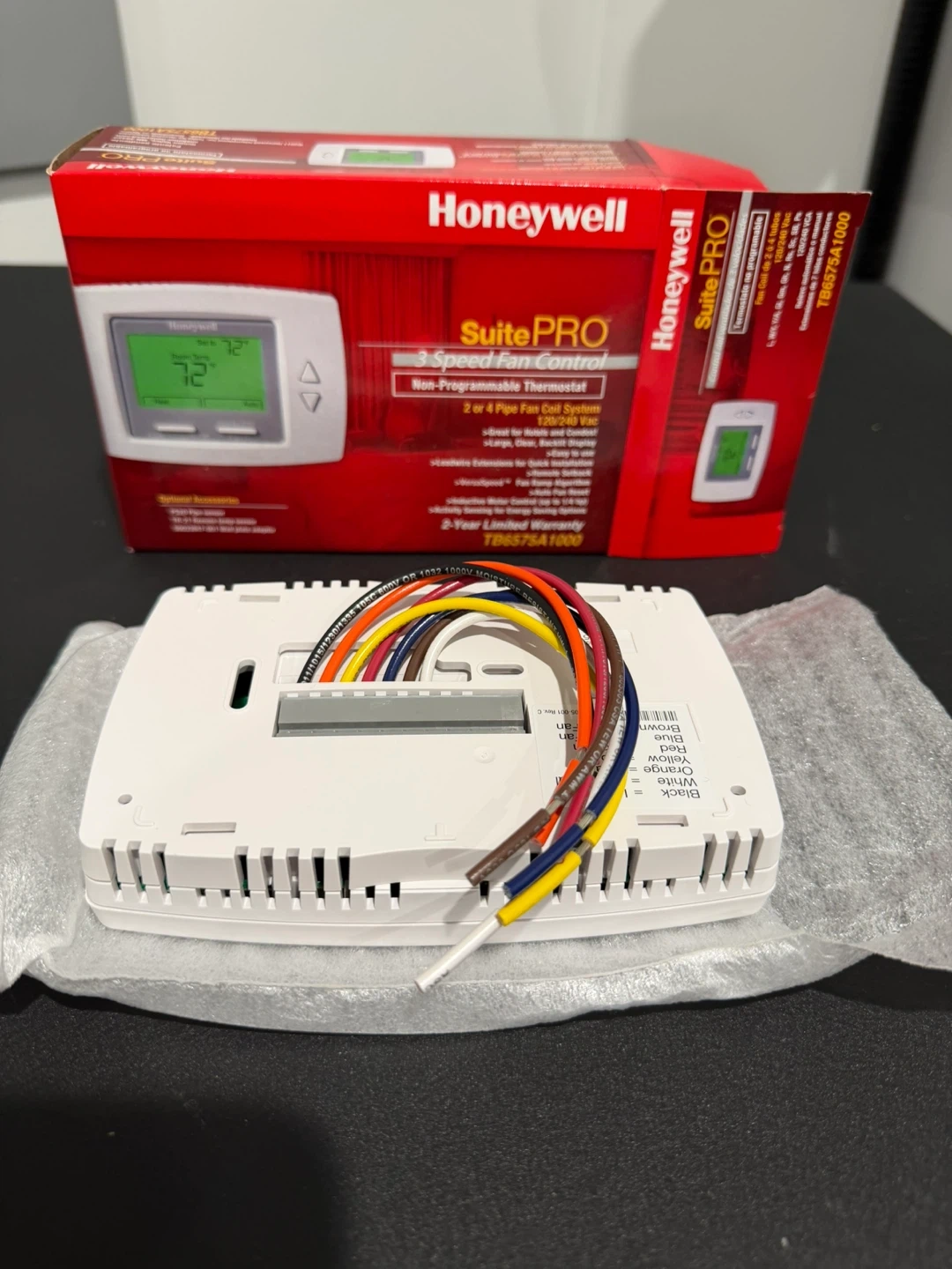 This is a Honeywell SuitePRO 3 Speed Fan Control Non-Programmable Thermostat. It's suitable for 2 or 4 Pipe Fan Coil Systems. Features include a large, clear backlit display and lead wire extensions for quick installation.