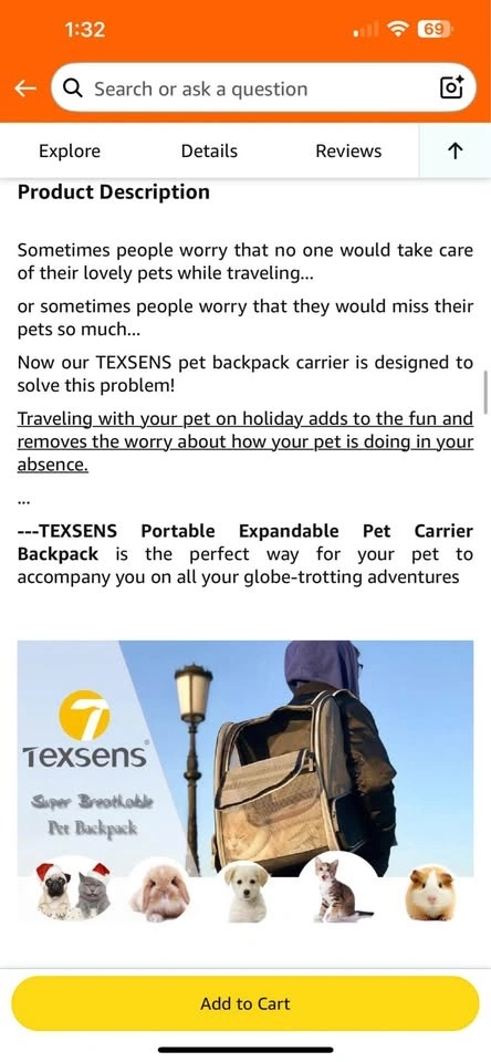 Texsens Pet Backpack Carrier for Small Cats Dogs | Ventilated Design, Safety Straps, Buckle Support, Collapsible | Designed for Travel, Hiking & Outdoor Use.