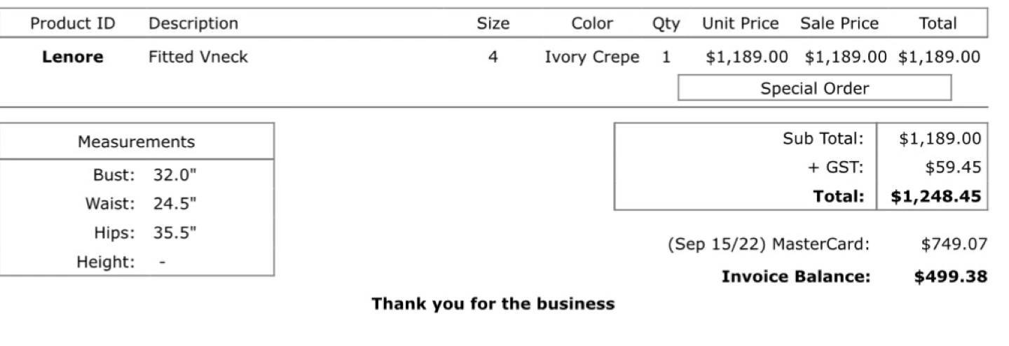 Attached are photos from the wedding, along with a copy of the invoice for size and color details.