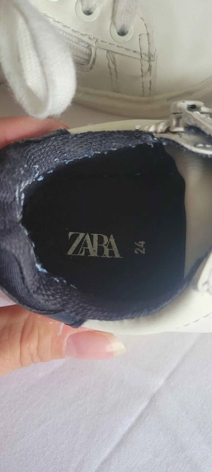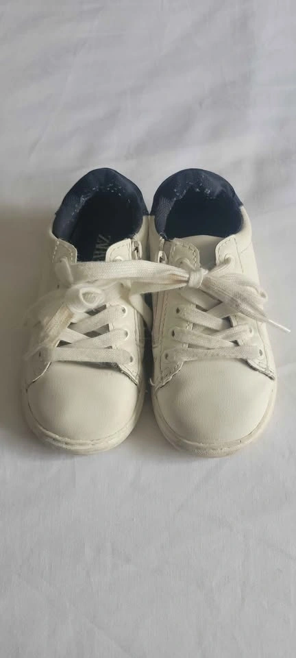 Stylish white and navy blue Zara kids shoes in size 24. Features both shoelaces and a convenient side zipper for easy on and off. Great for everyday wear! Gently used. From a smoke-free home. Check out my other listings for more Zara kids clothes, shoes, and beanies!