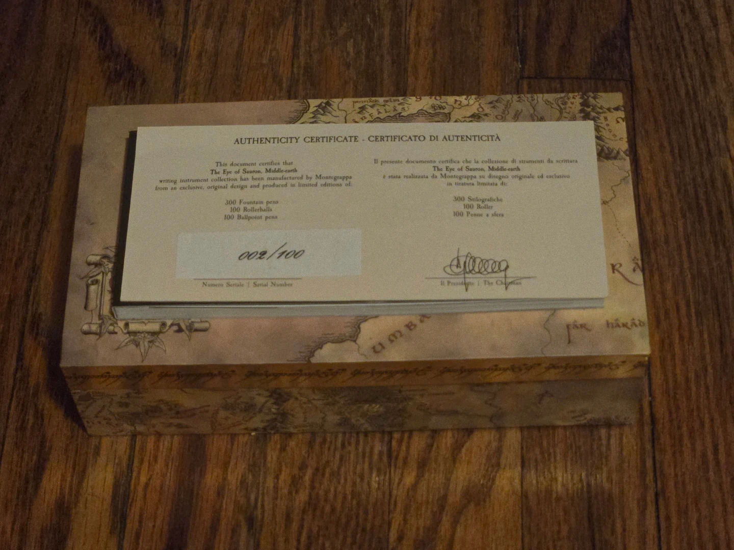 This Montegrappa fountain pen is from The Lord of the Rings collection. It's the 2nd of 100 made, and the first released from the factory. It comes in its original box with an authenticity certificate. The box has minor damage.