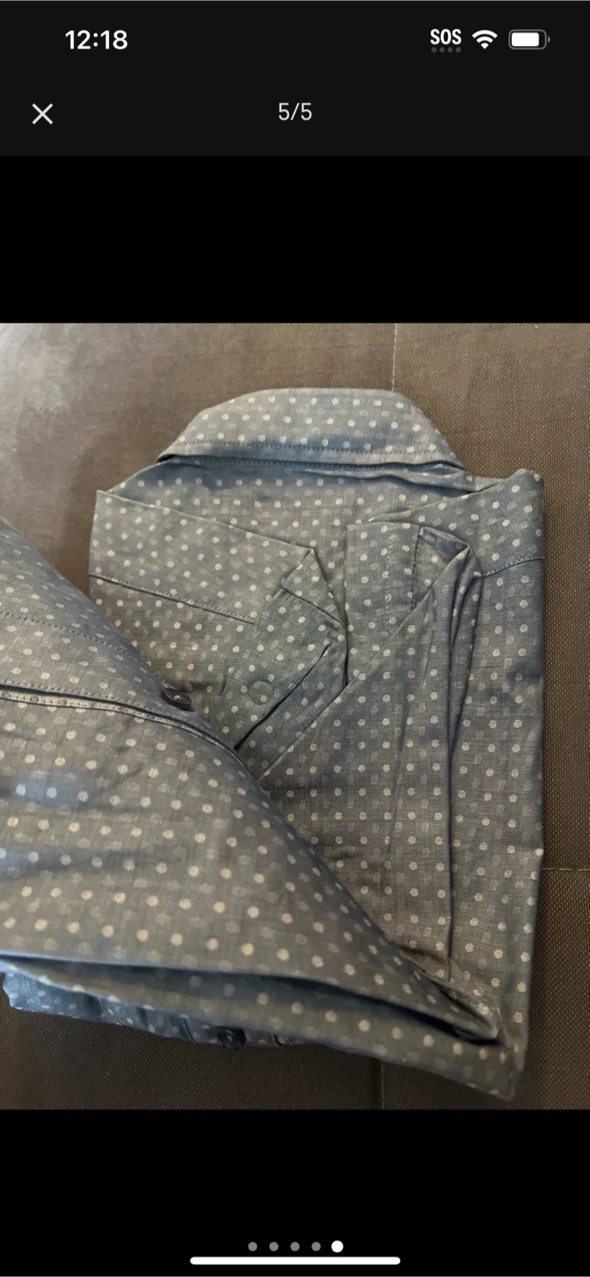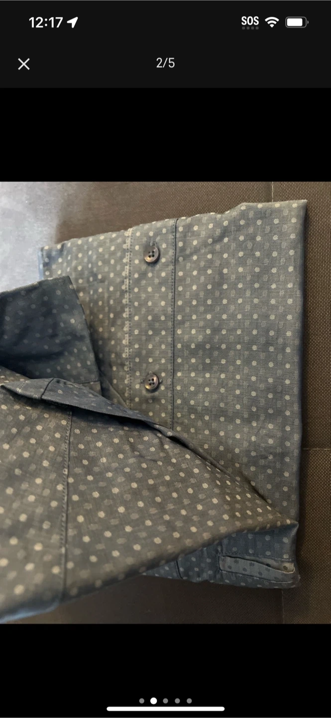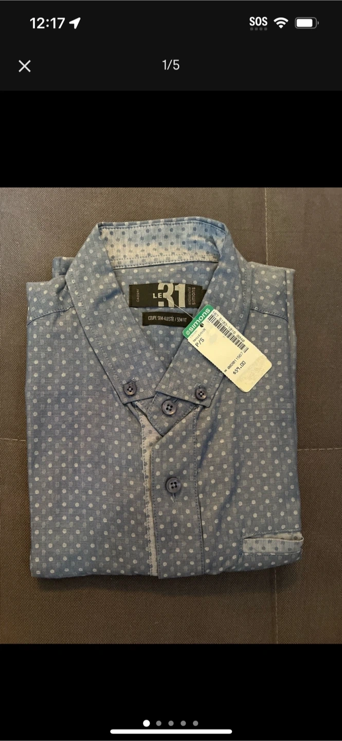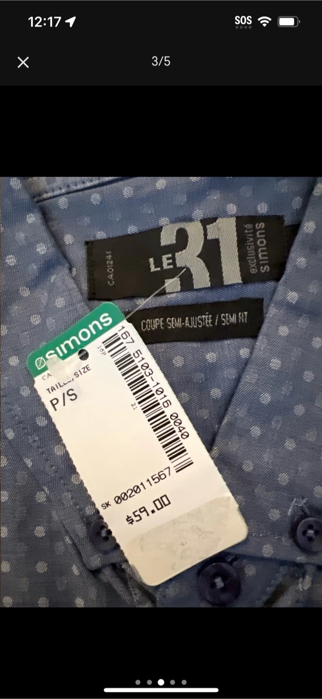Here's a Le 31 Simons semi-fit shirt in size small. It features a stylish polka dot pattern and would be a great addition to any wardrobe! The original price tag shows $59.00