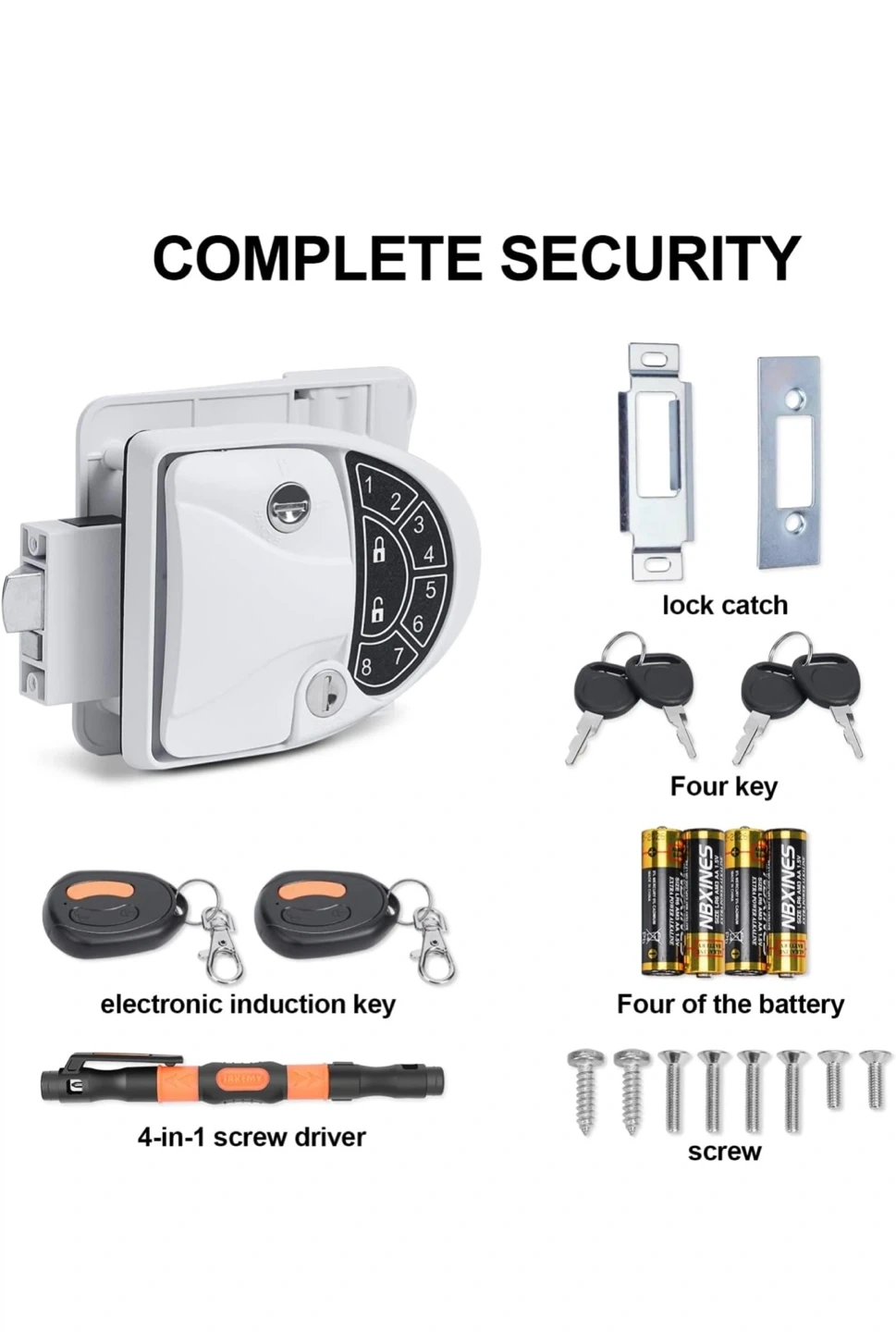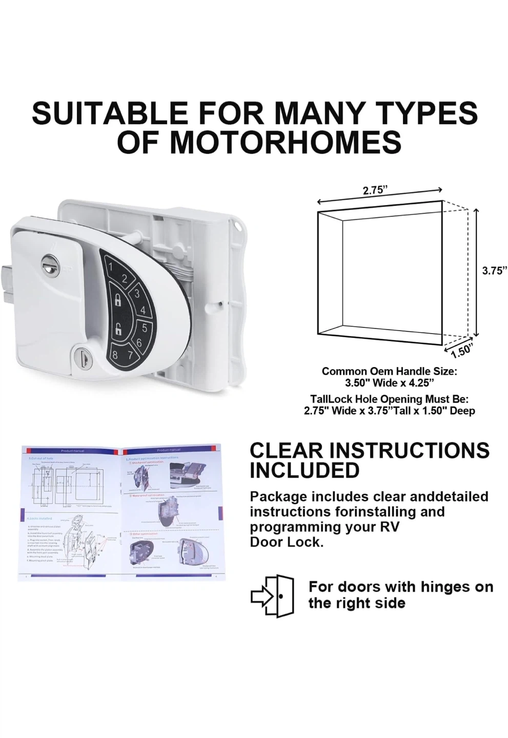 It features a backlit keypad and comes with 2 electronic induction keys, 4 keys, and a screwdriver. It's designed to fit a 2.75" x 3.75" lock hole. The package includes clear instructions for installing and programming your RV door lock