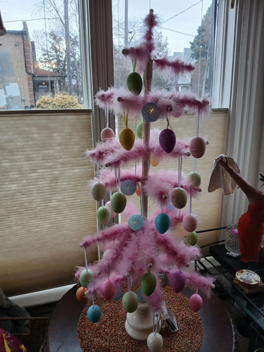 A cute pink mariboo Easter tree decorated with assorted pastel-coloured, glittery egg ornaments and a string of lights. It's perfect for adding a festive touch to your home during the spring season! Tree has been used for Valentine's Day and a glamorous Christmas Tree.