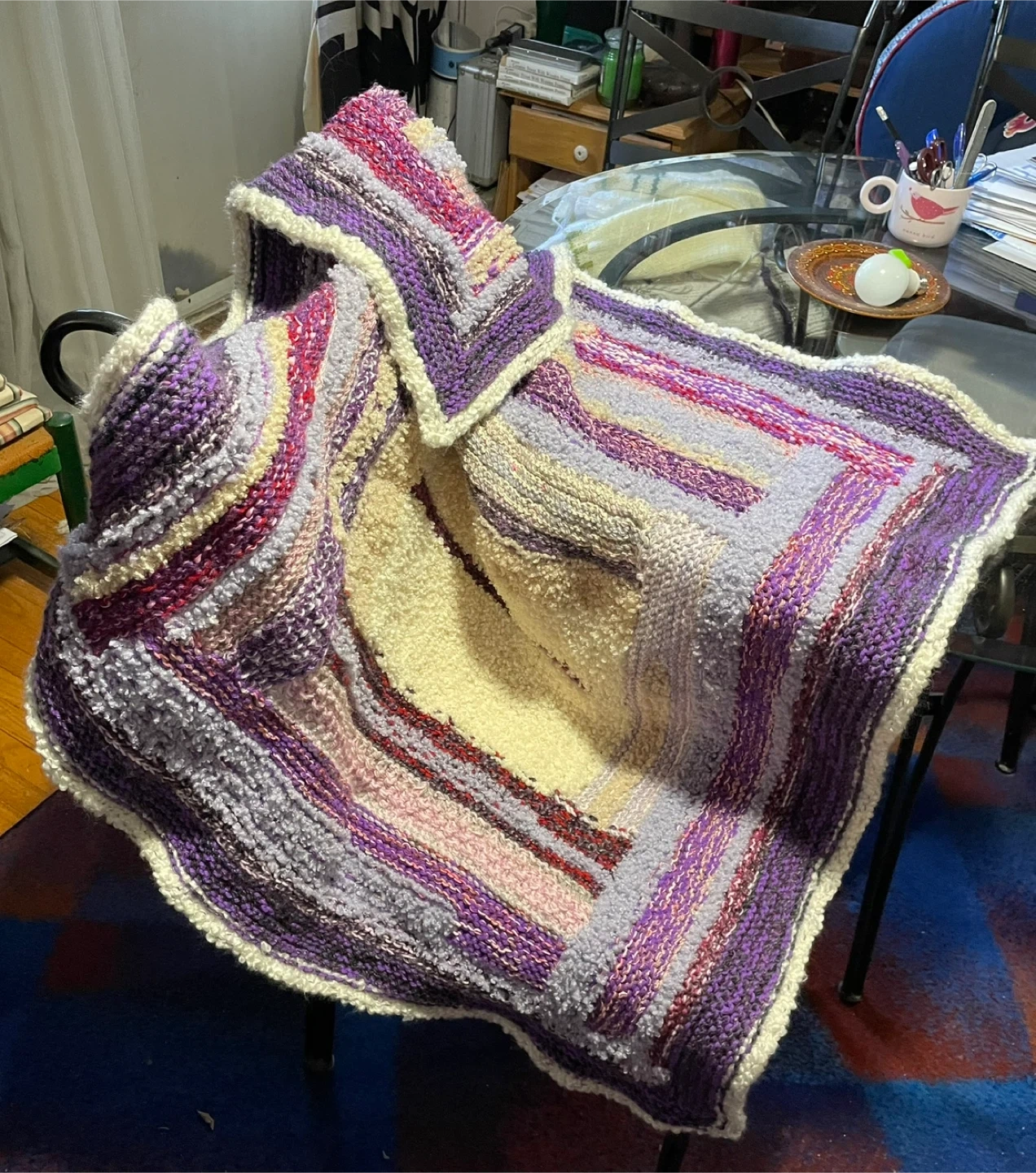 This is a handmade personal blanket, perfect for keeping you cozy. It features a soft texture and a lovely pattern of purples, pinks, and creams. Great for a nap on the couch or adding a touch of warmth to your favourite chair!