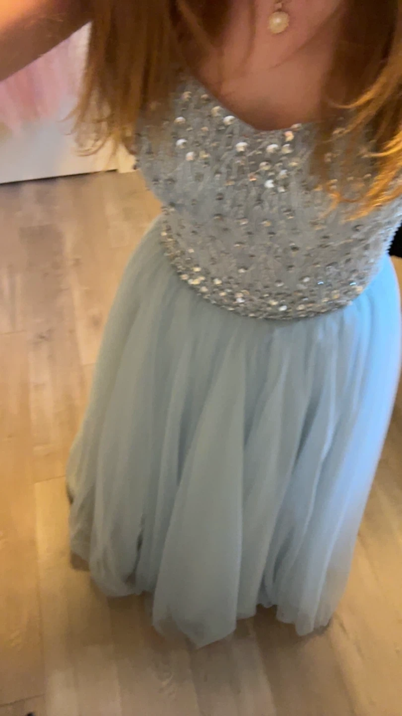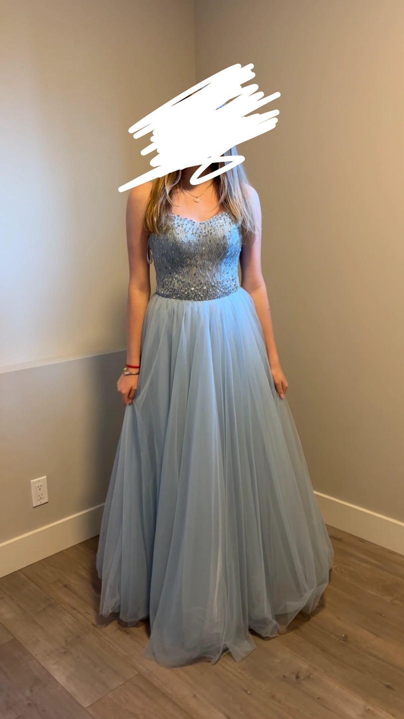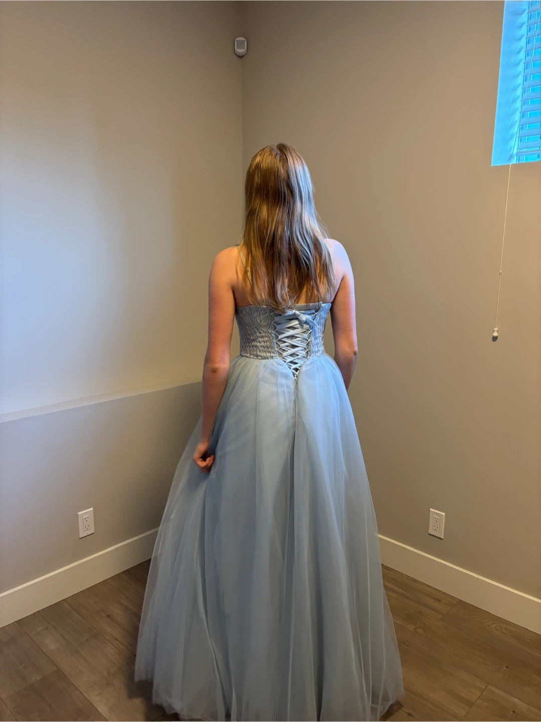 Selling a beautiful light blue tulle dress, perfect for prom or an evening event! It features a beaded bodice and a full tulle skirt. The dress has a corset back, allowing for some adjustability in sizing. It's in great condition and ready for its next special occasion