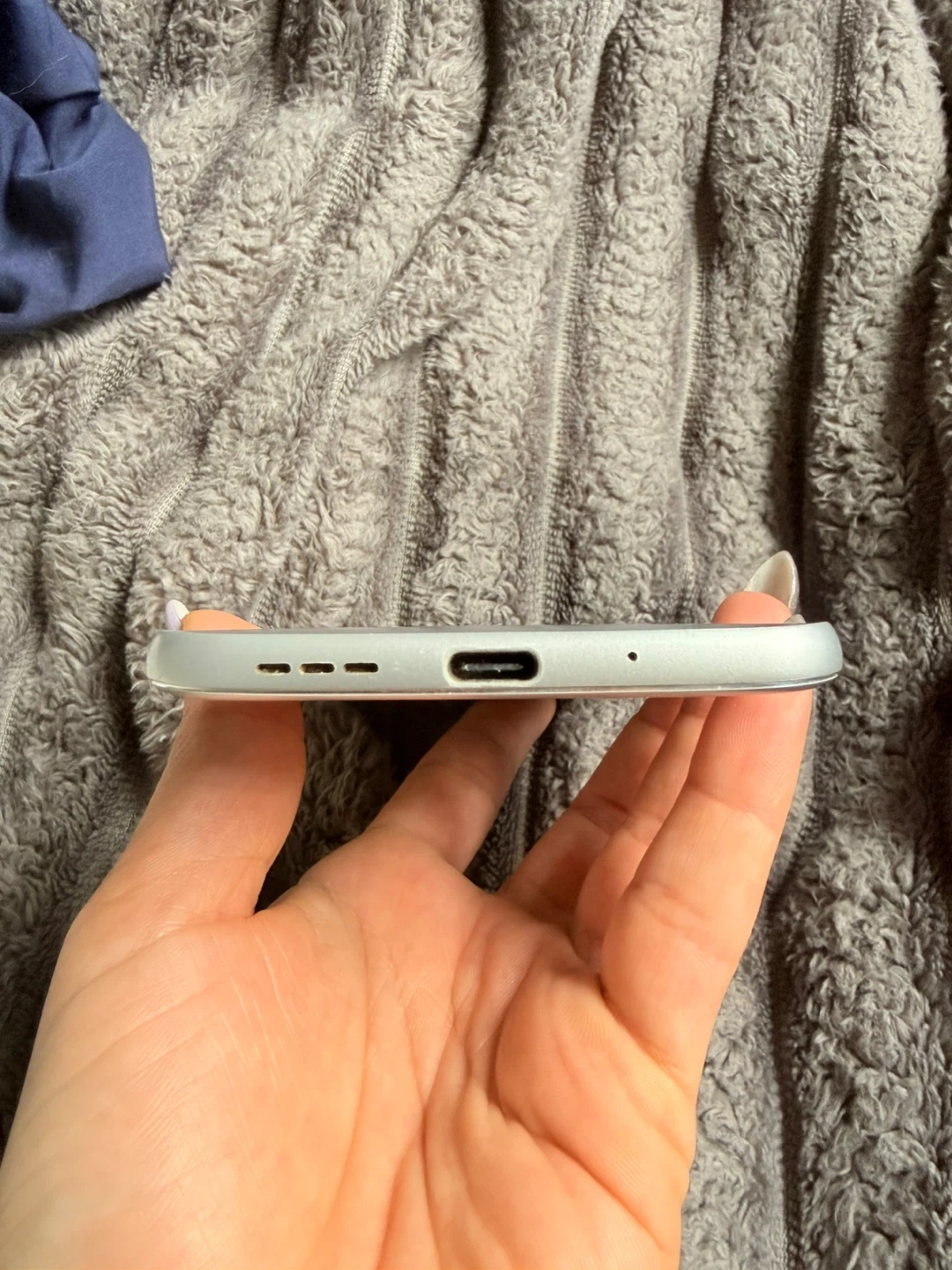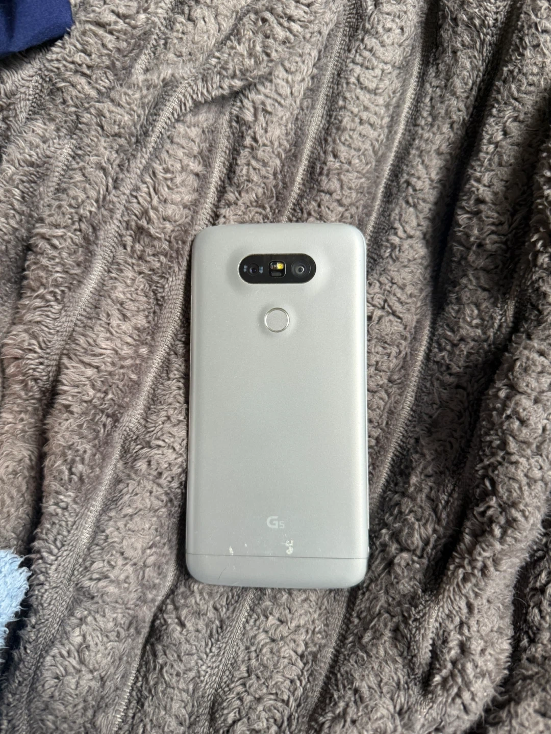 This is an LG G5 smartphone in silver. It features a dual rear camera setup and a fingerprint sensor on the back. The USB-C port is located on the bottom edge.
