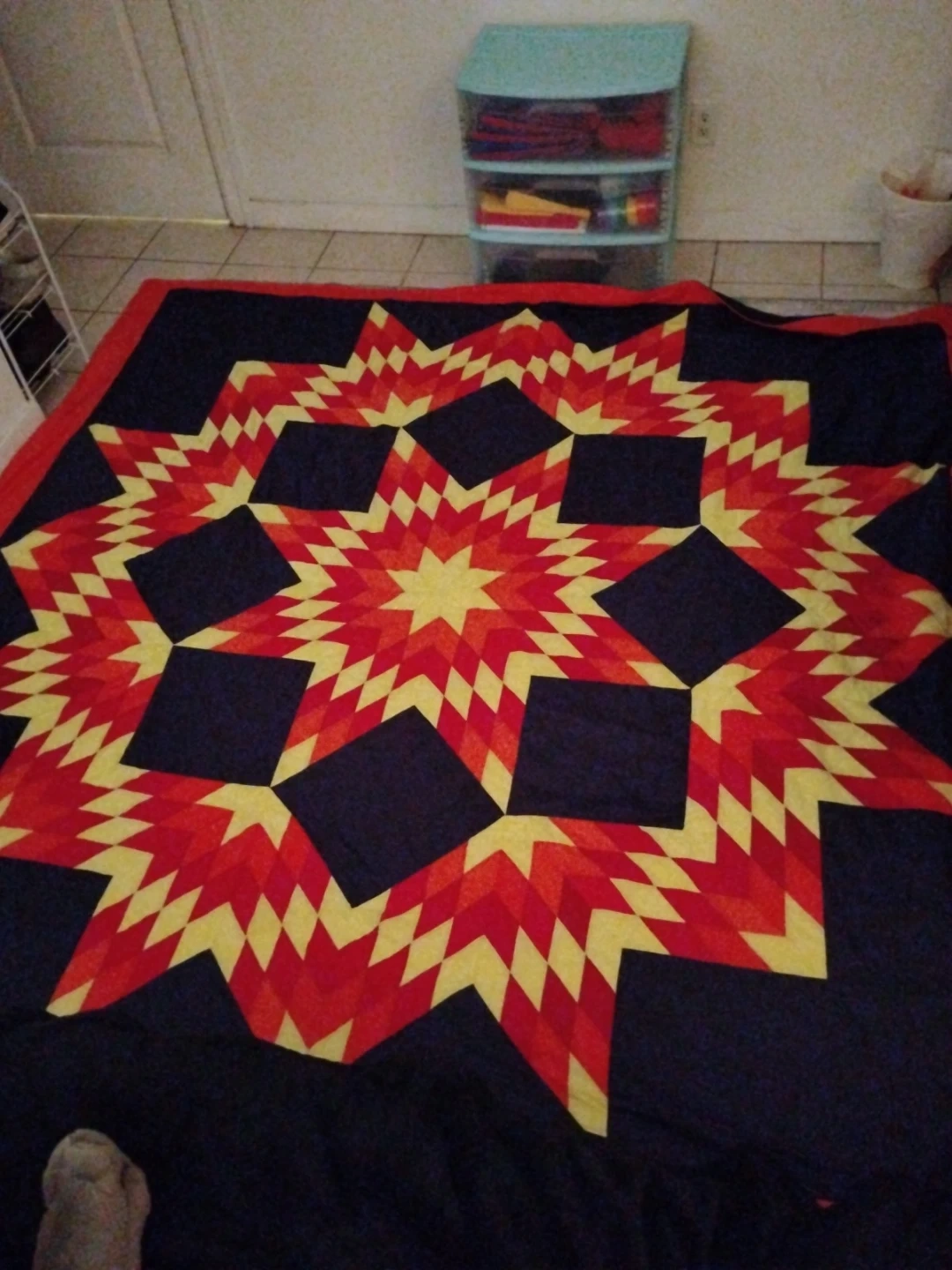 Beautiful handmade quilt with a vibrant geometric star design. Features a striking pattern in red, orange, yellow, and navy blue. It's perfect for adding a cozy touch to any room. This quilt is a great decorative piece.