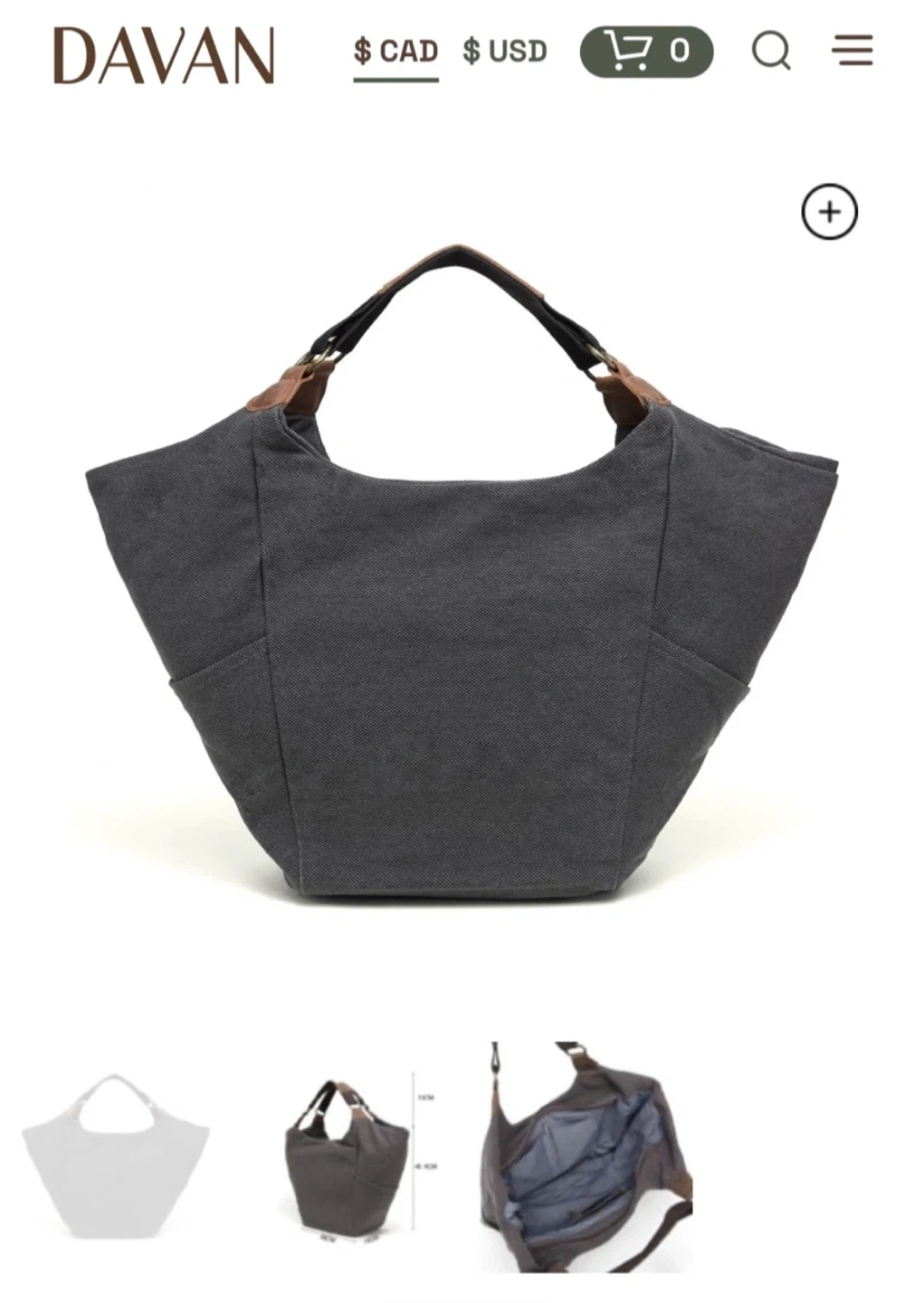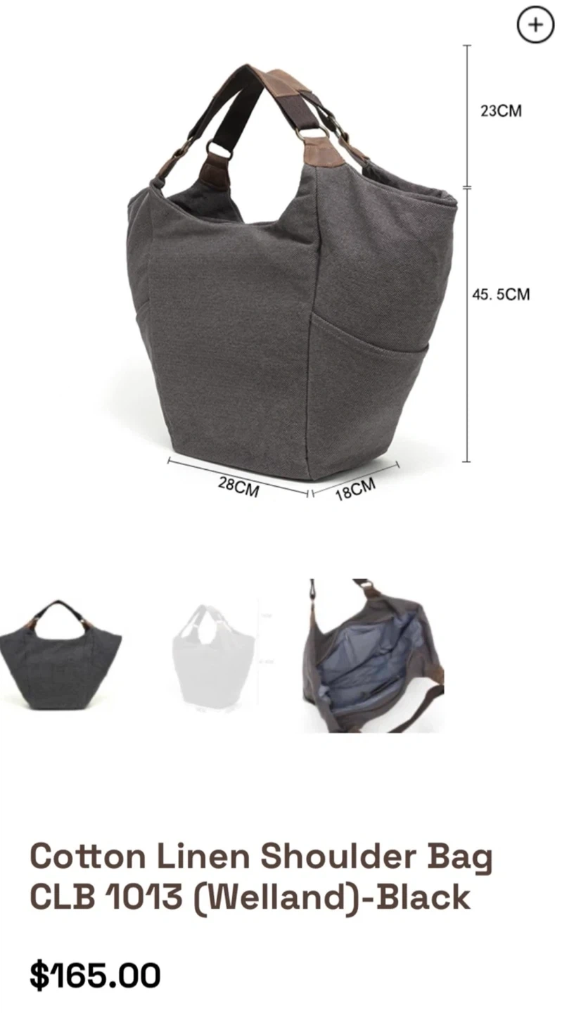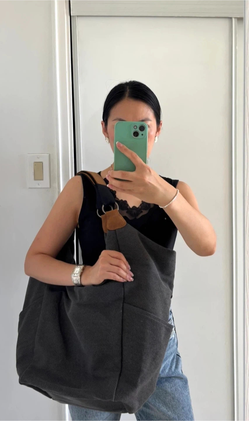 This is a dark gray cotton linen/leather large shoulder bag. It has dimensions of 45.5cm height, 28cm width, and 18cm depth.