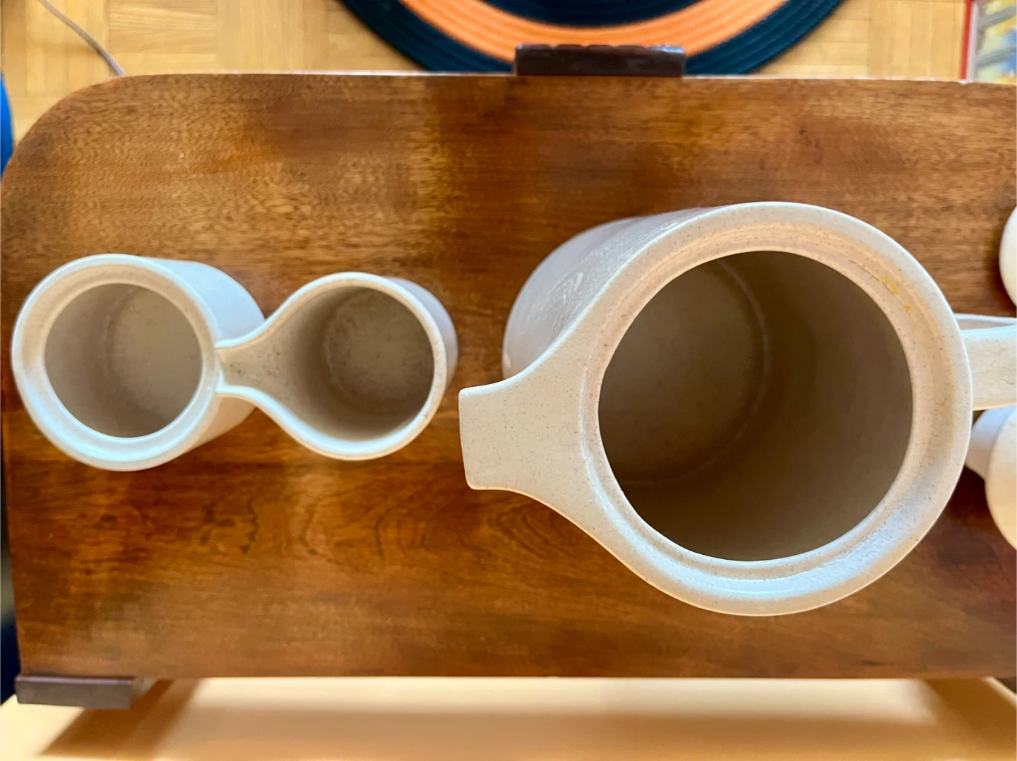 🥕 Coffee pot, milk and lidded sugar from the Govancroft Stoneware Lunar Range, in oatmeal glaze. Great shape designed by Kenneth Southall and launched 1970.