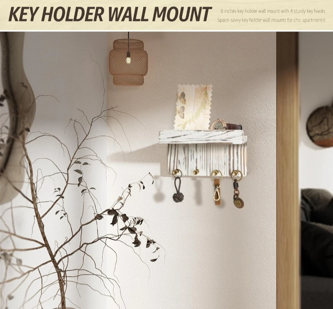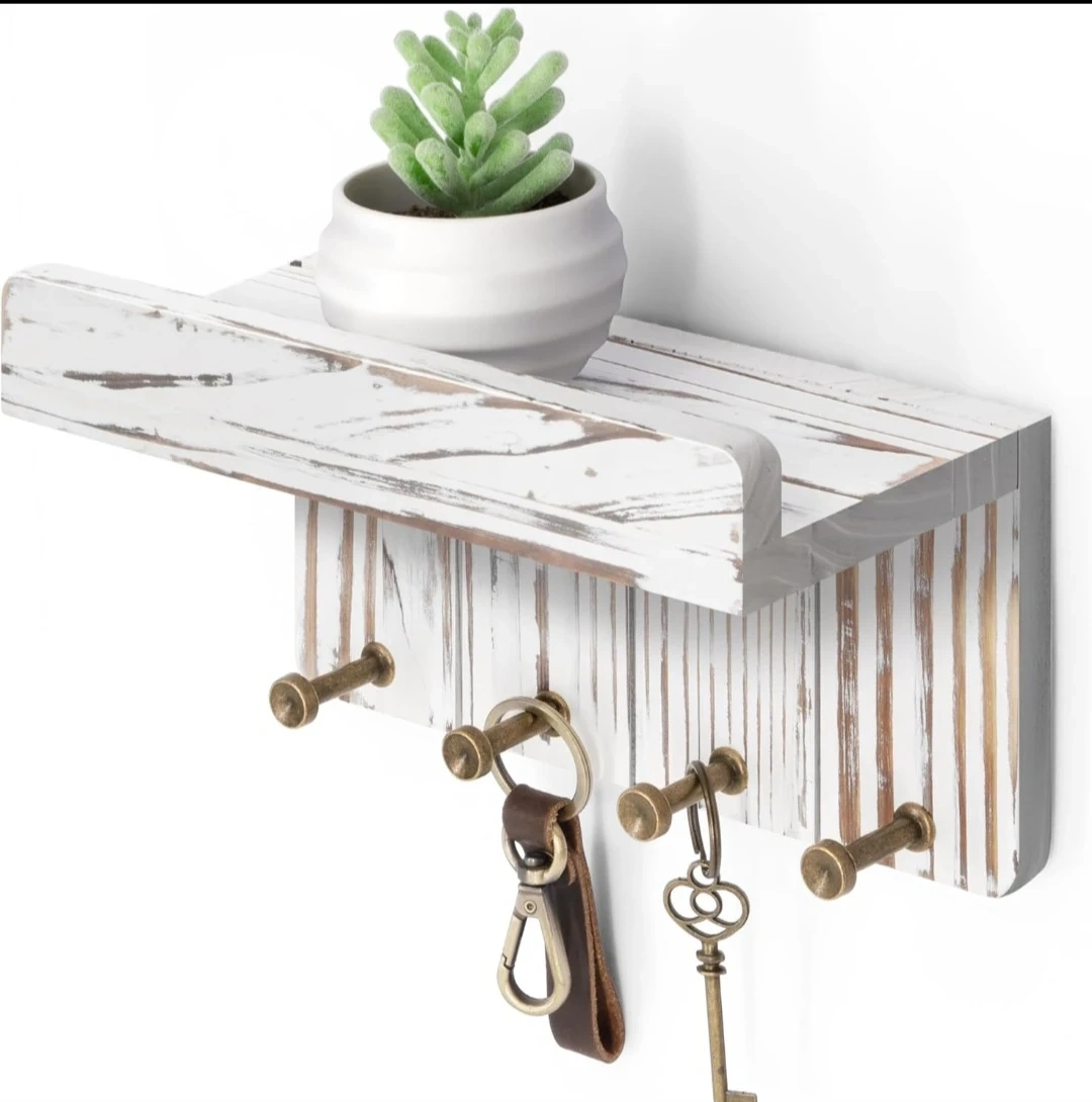 This wall mount key holder features a rustic white wood design with a small shelf for letters or decor. It comes with 4 sturdy hooks for keys, mail, or lightweight accessories. Perfect for entryway organization!