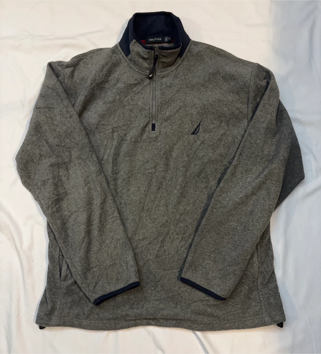 Lightweight Nautica pullover. Quarter-zip neckline with zipper pull. Navy sail logo on chest. Subtle navy trim at cuffs and collar. Versatile casual layer. $20 cash, porch pick up Kennedy and Eglinton.