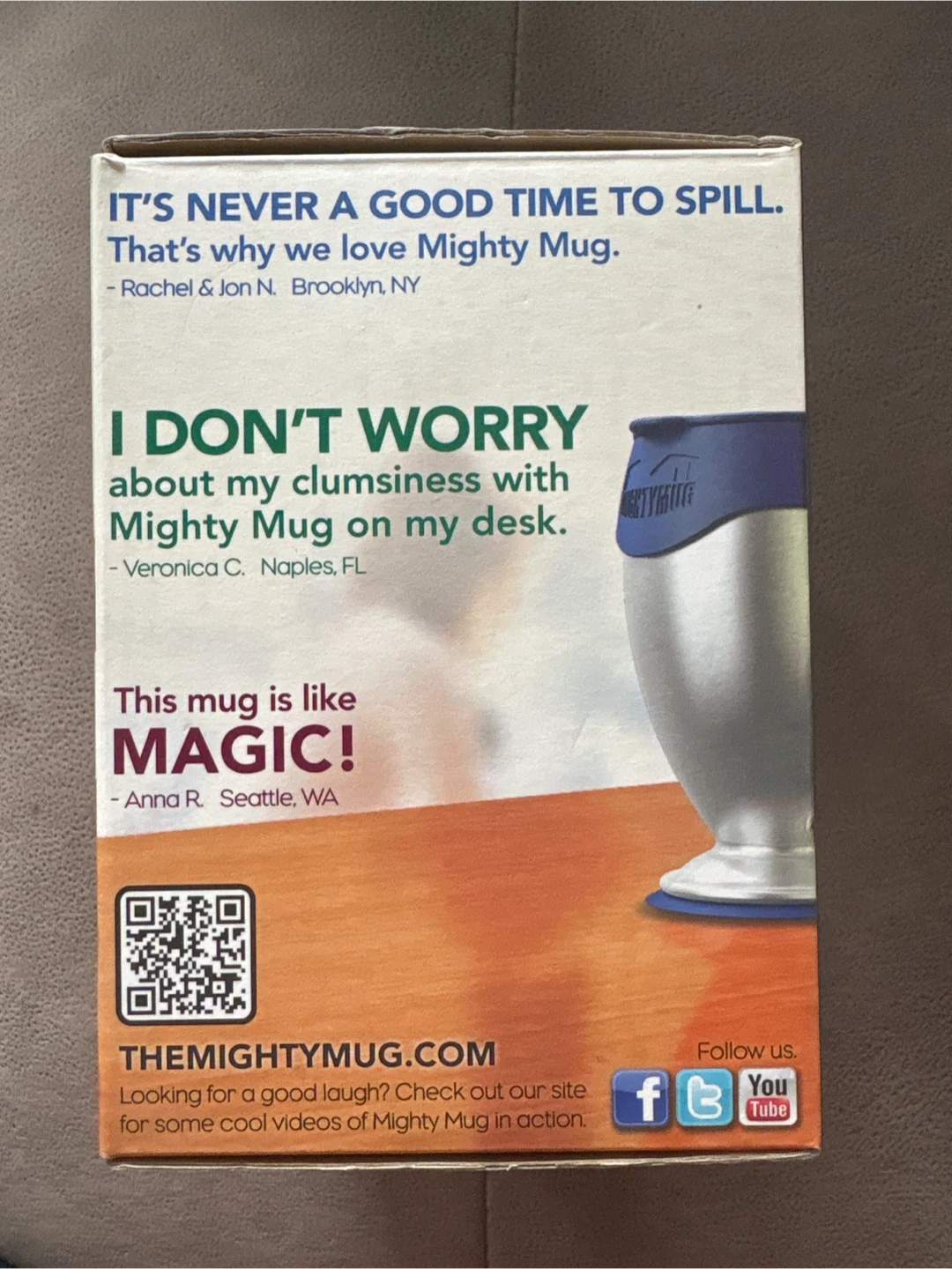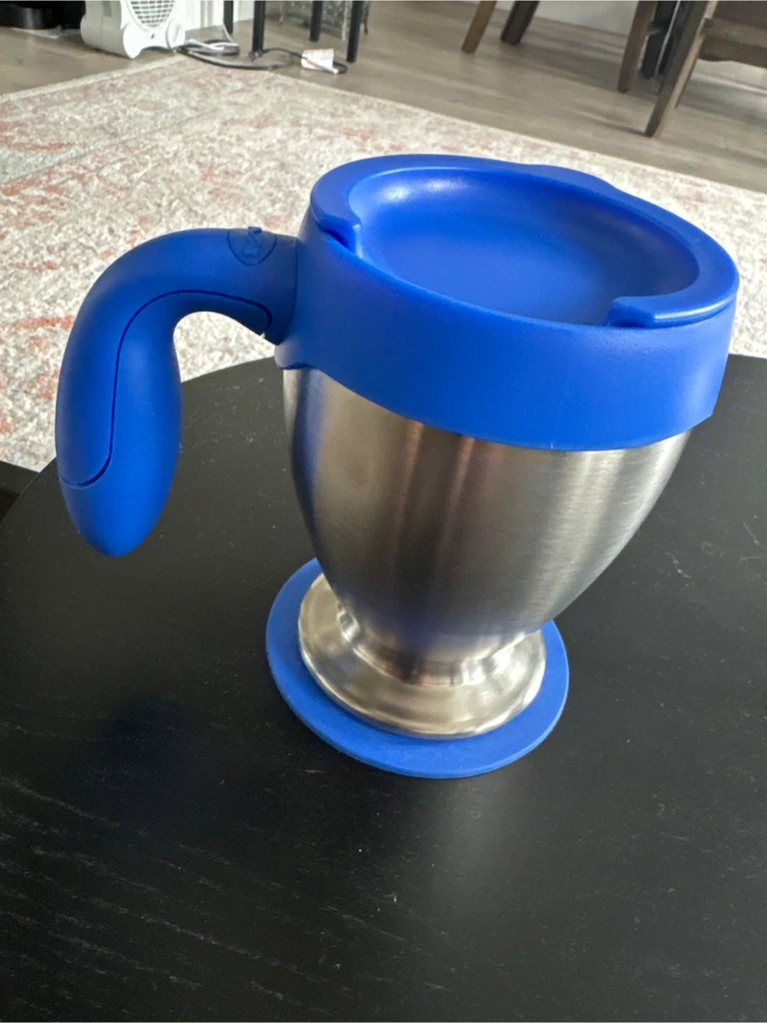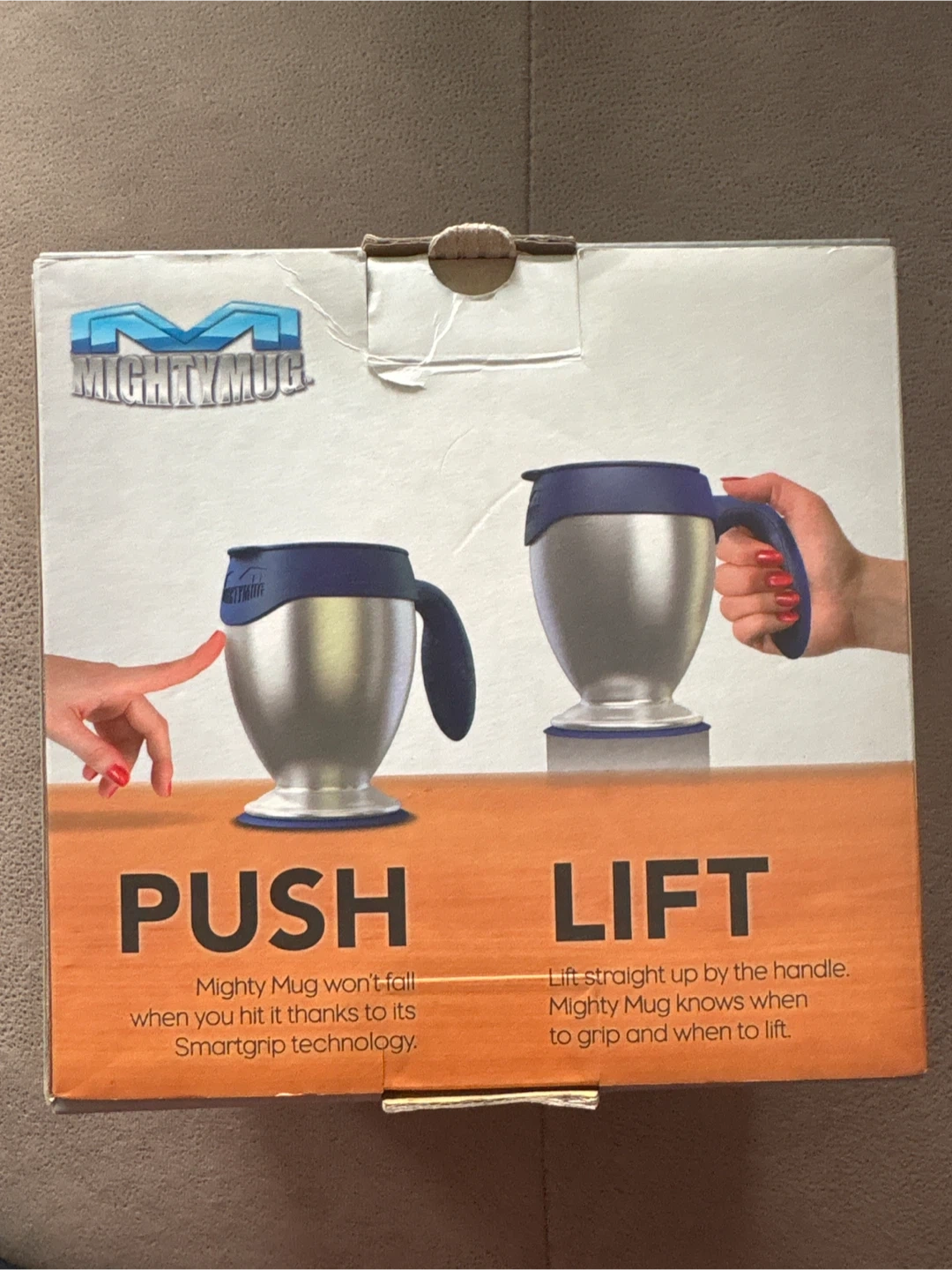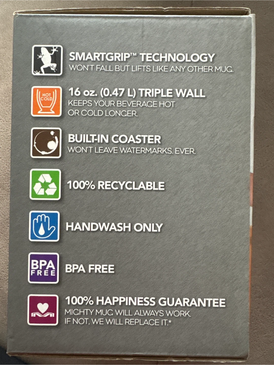 This is a 16 oz Mighty Mug with SmartGrip technology. It features triple-wall insulation to keep beverages hot or cold. The mug is BPA-free and comes with a built-in coaster.
