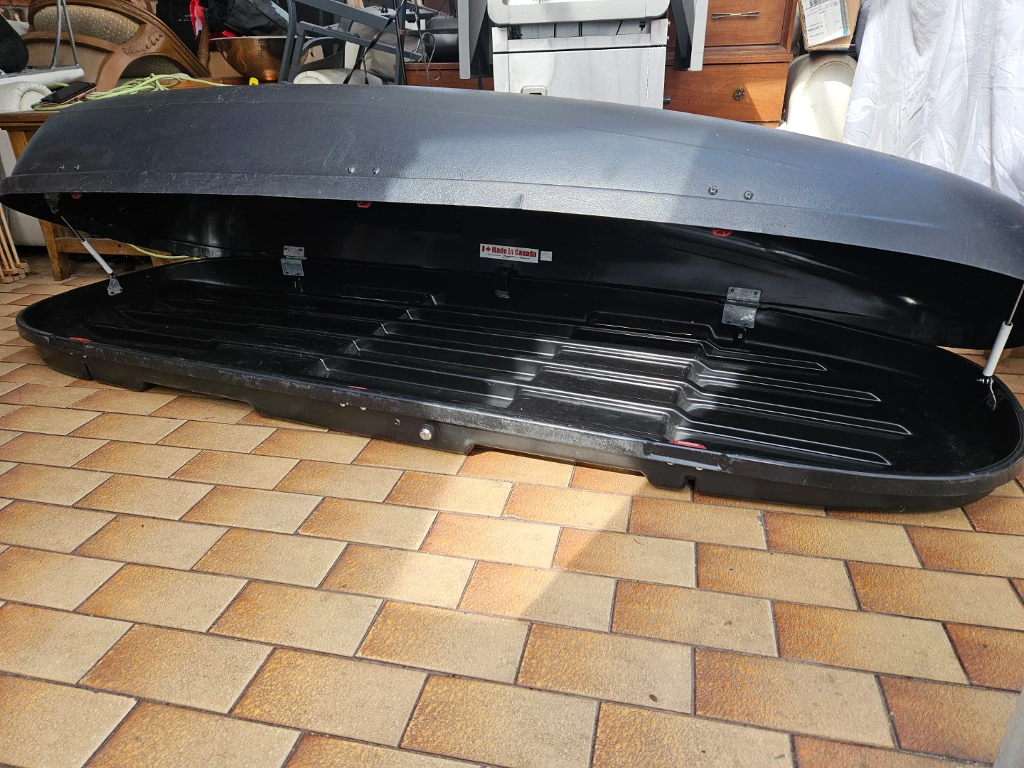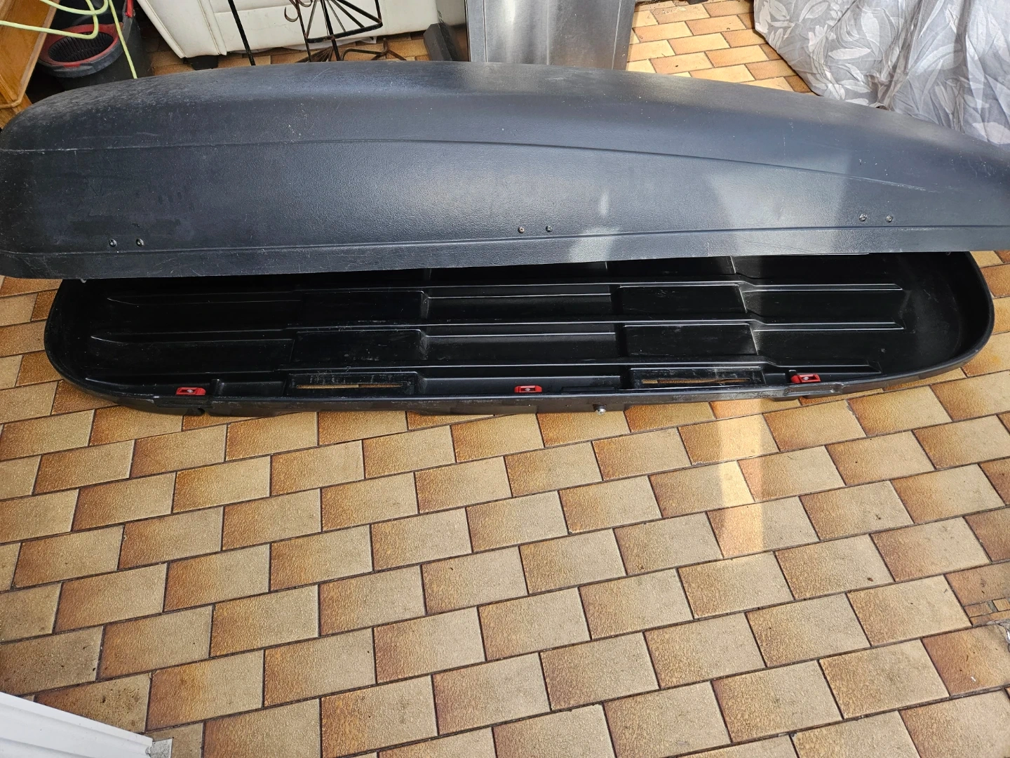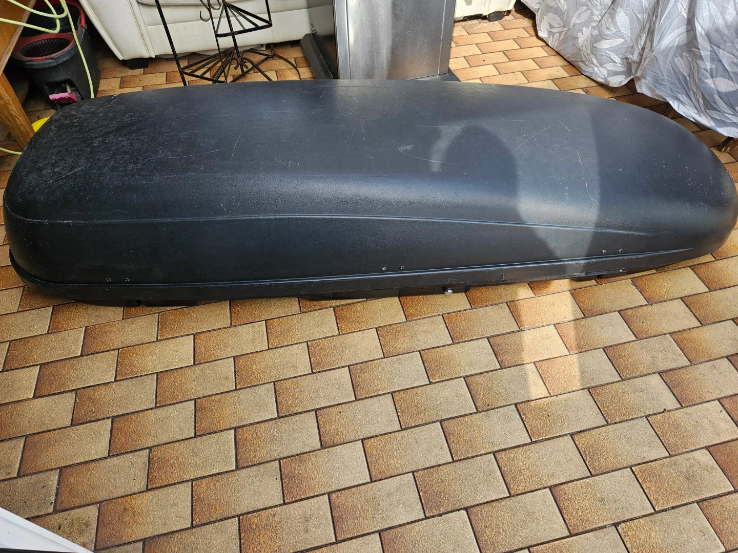 This is a black cargo roof box for your vehicle. It's made of durable plastic and opens from the top. Ample storage space for your gear!