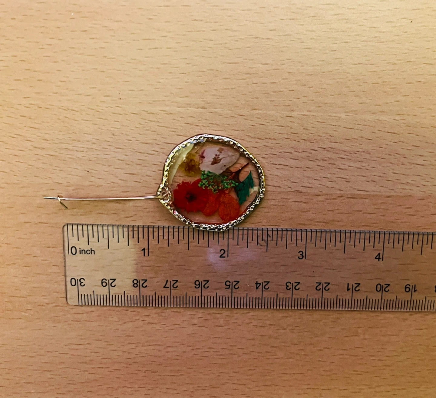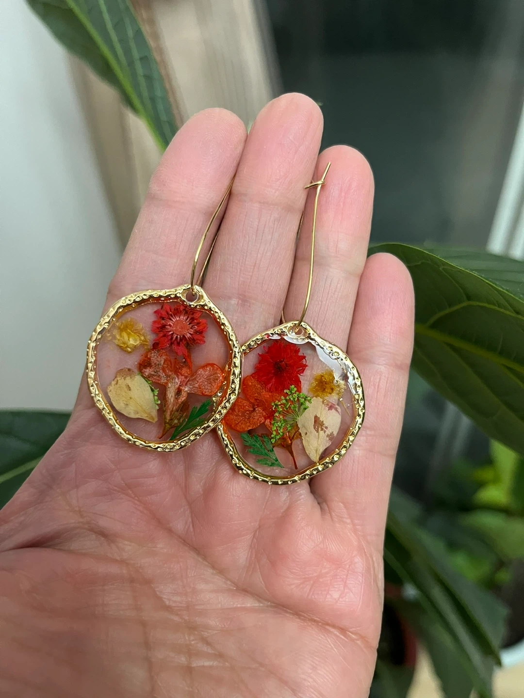 These beautiful hoop earrings showcase real dried flowers encased in clear resin. The gold-tone hoops add a touch of elegance. The earring pendants measure approximately 1.5 inches in diameter.