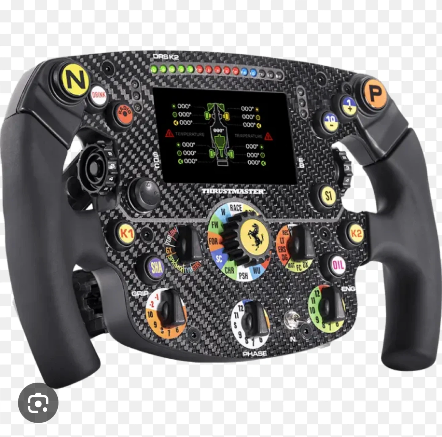This is the Thrustmaster sf-1000 Formula steering wheel. It's designed for immersive racing simulations. The wheel features a carbon fiber look and a central display with multiple readouts and all functioning buttons.
