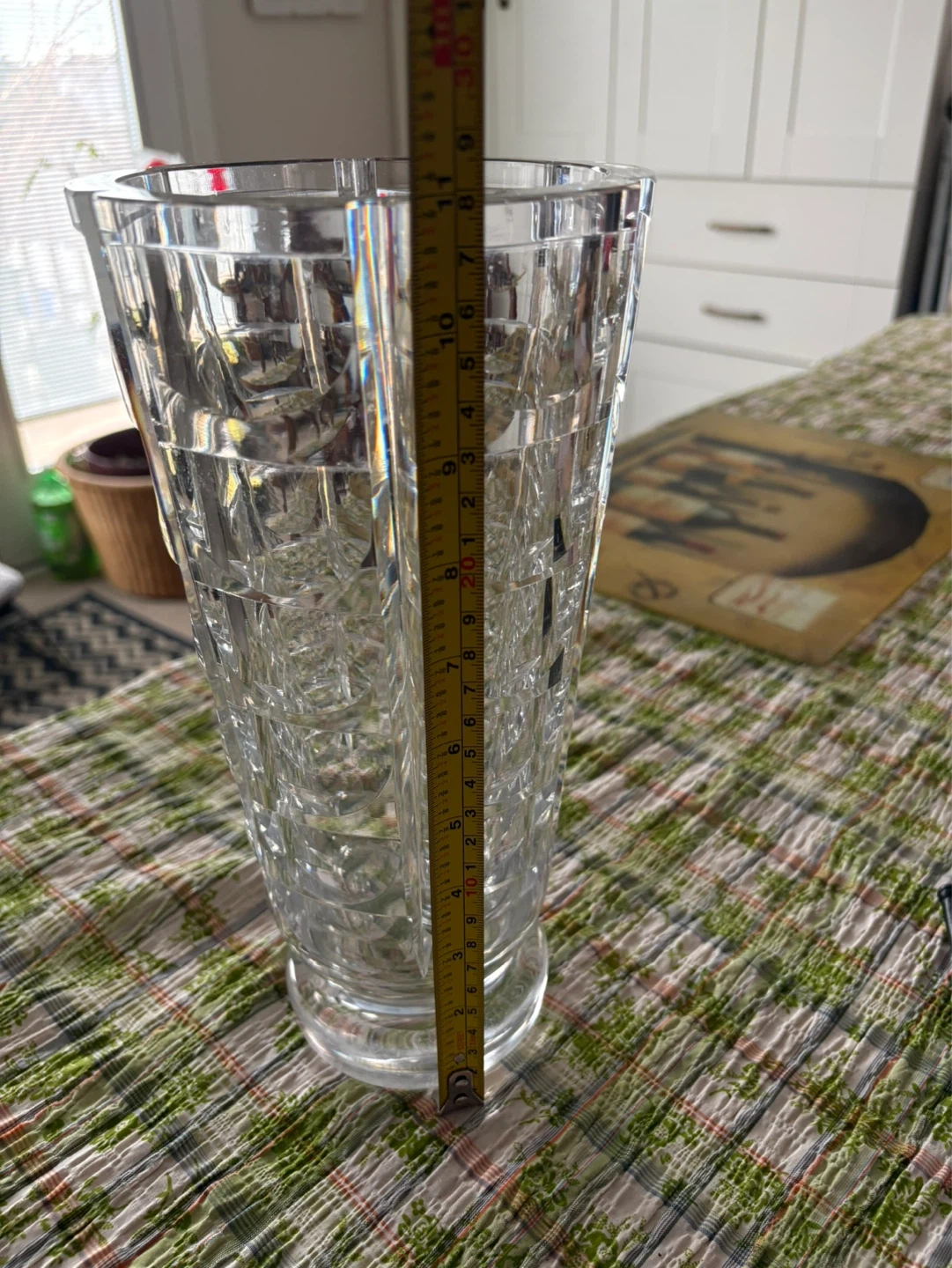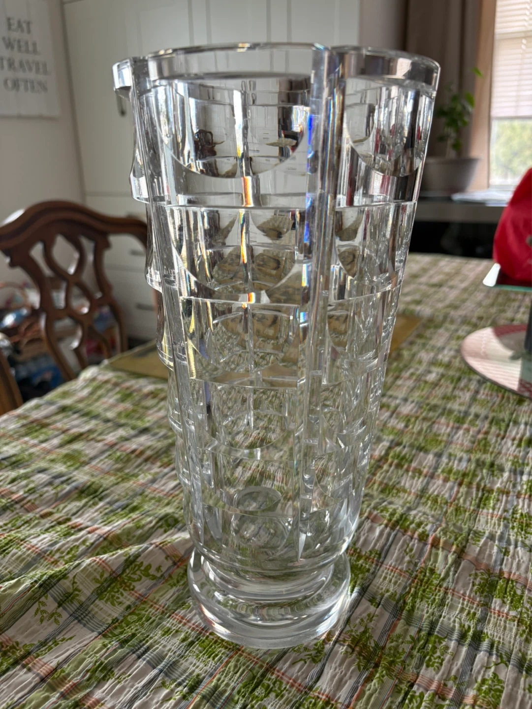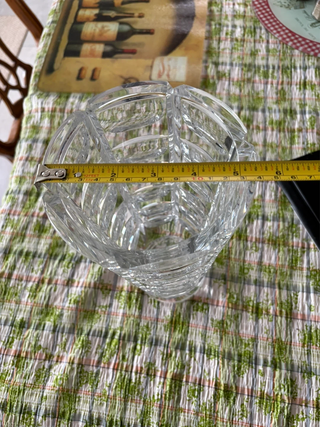 This is a clear crystal vase with a cut glass design. It measures approximately 9.5 inches tall with a 5-inch opening. It's a beautiful piece for holding flowers.