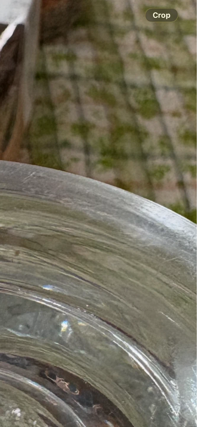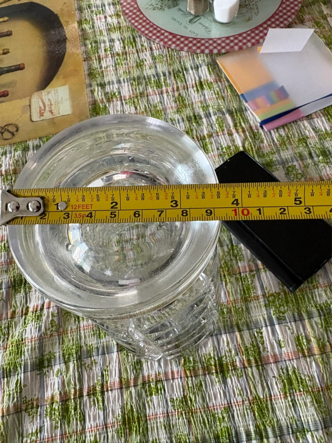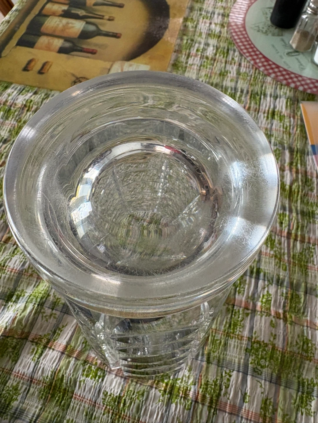 This is a clear crystal vase with a cut glass design. It measures approximately 9.5 inches tall with a 5-inch opening. It's a beautiful piece for holding flowers.