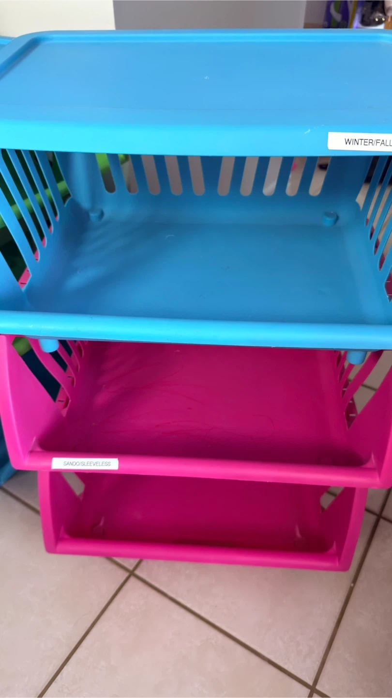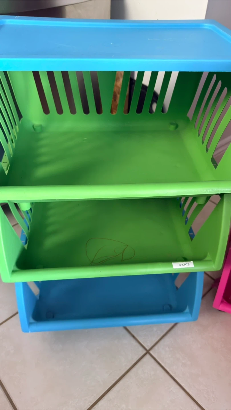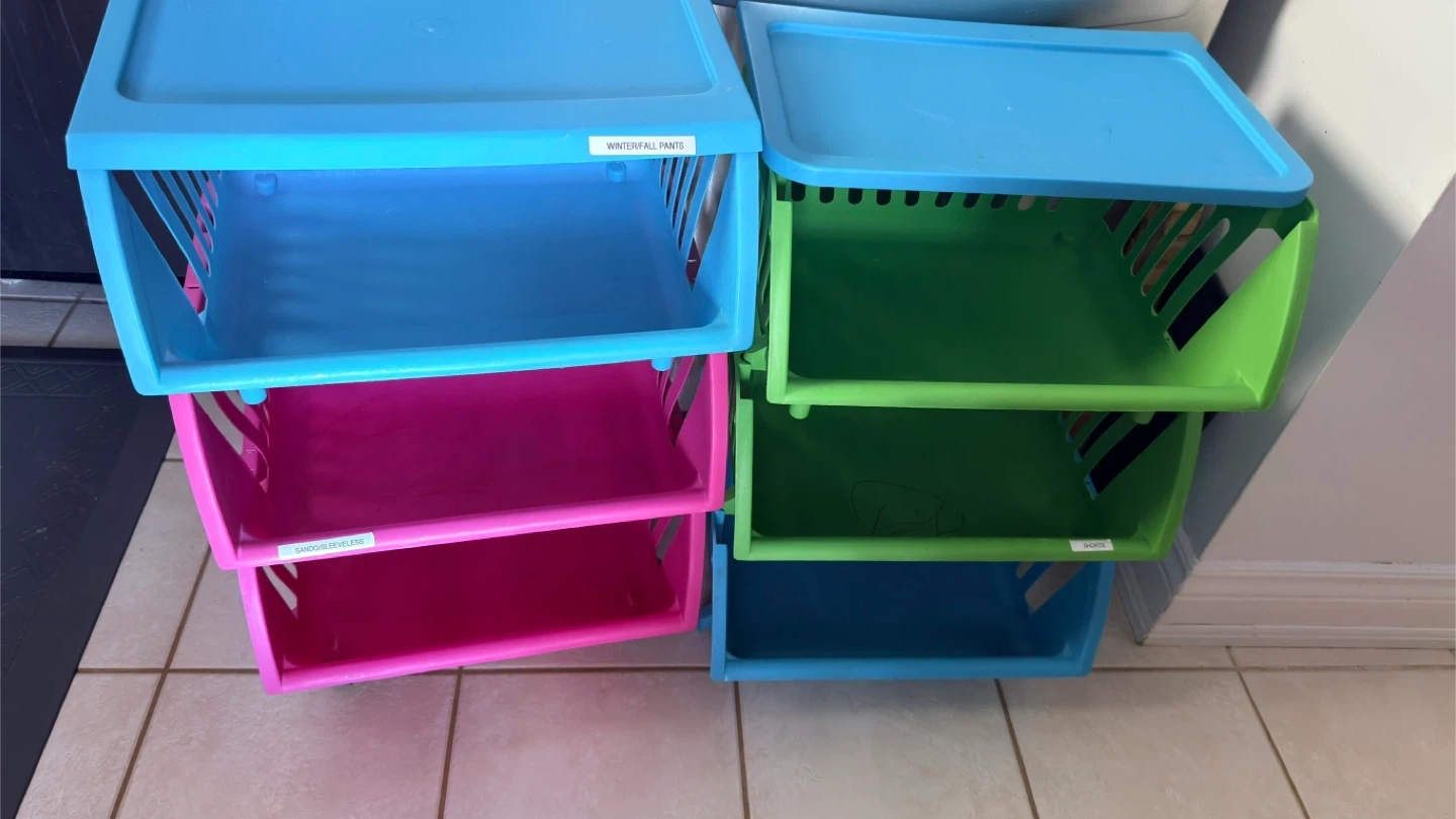 Blue and green stackable storage bins with lids. Each bin has a clear label slot. Great for organizing clothes or other household items. Plastic construction. 3 sets