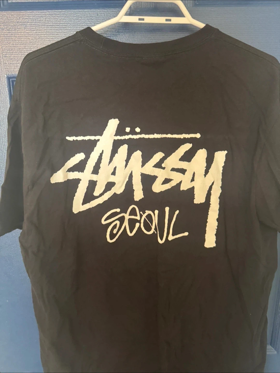 Black Stussy T-shirt with "Stussy Seoul" graphic.