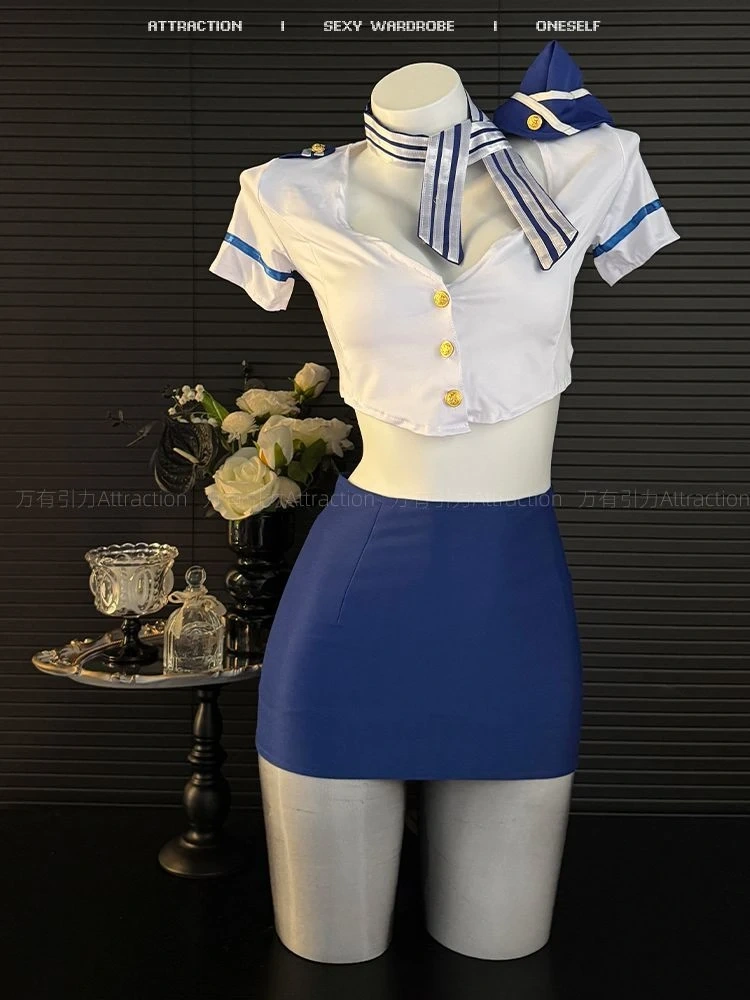 This women's flight attendant costume set includes a white crop top with blue trim and a matching blue mini skirt. It also comes with a striped scarf and a small blue hat. Perfect for themed parties or dress-up events!