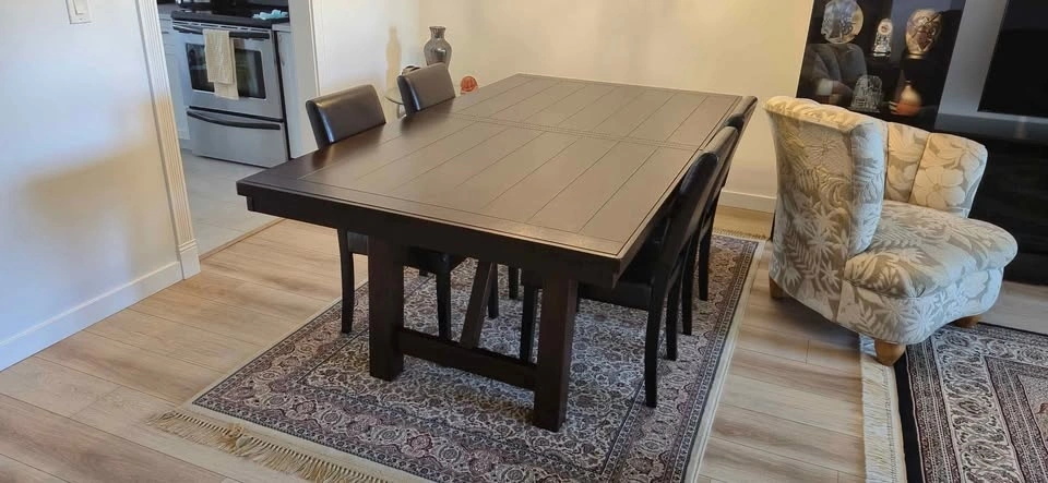 Very well kept dining table. Good quality and versatile. Includes a removable leaf that extends table at the center. Max capacity with leaf is 8 people. Downsizing sale.