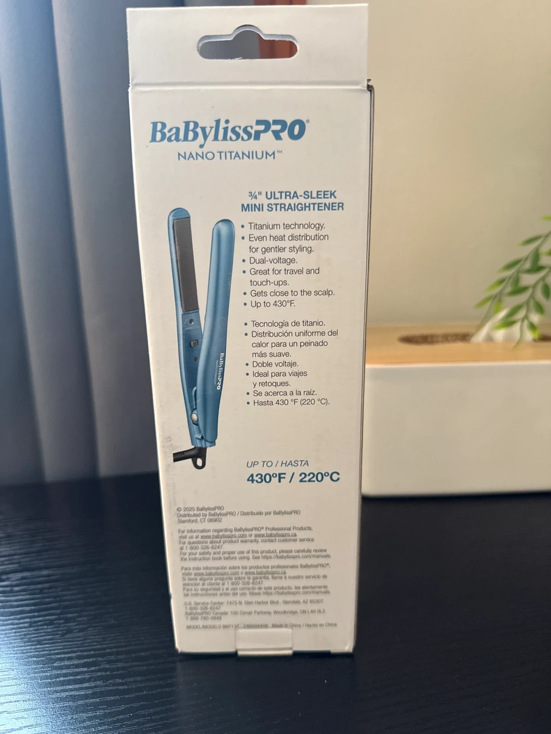 This is a BaBylissPRO Nano Titanium 3/4" Ultra-Sleek Mini Straightener. It's designed with titanium technology for gentle styling and even heat distribution. Heats up to 430°F (220°C). Great for travel and touch-ups!