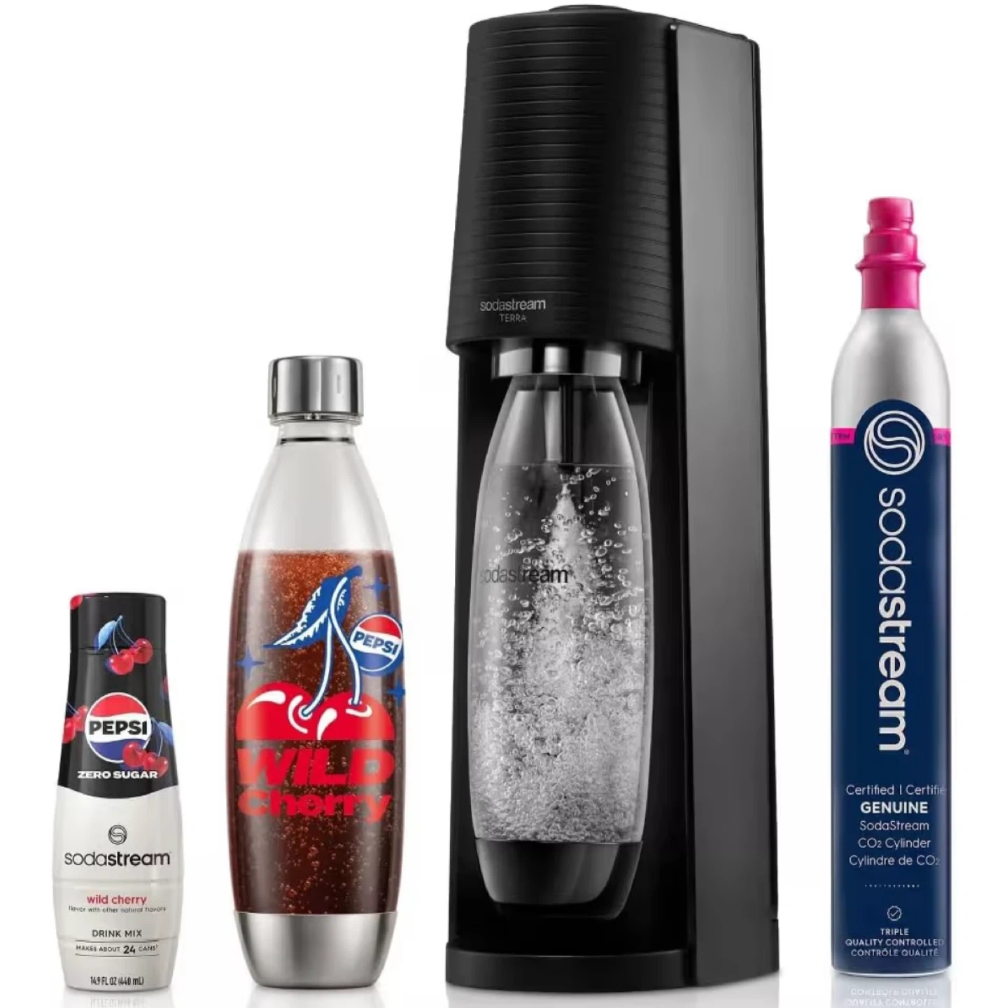 🇺🇸 The kit includes everything you need to start making sparkling water today - just add water (1) Terra Sparkling Water Machine, (1) 60L Quick Connection Pink CO2 Cylinder and (1) 1L Special Edition Wild Cherry Pepsi Bottle (1) Wild Cherry Pepsi Zero