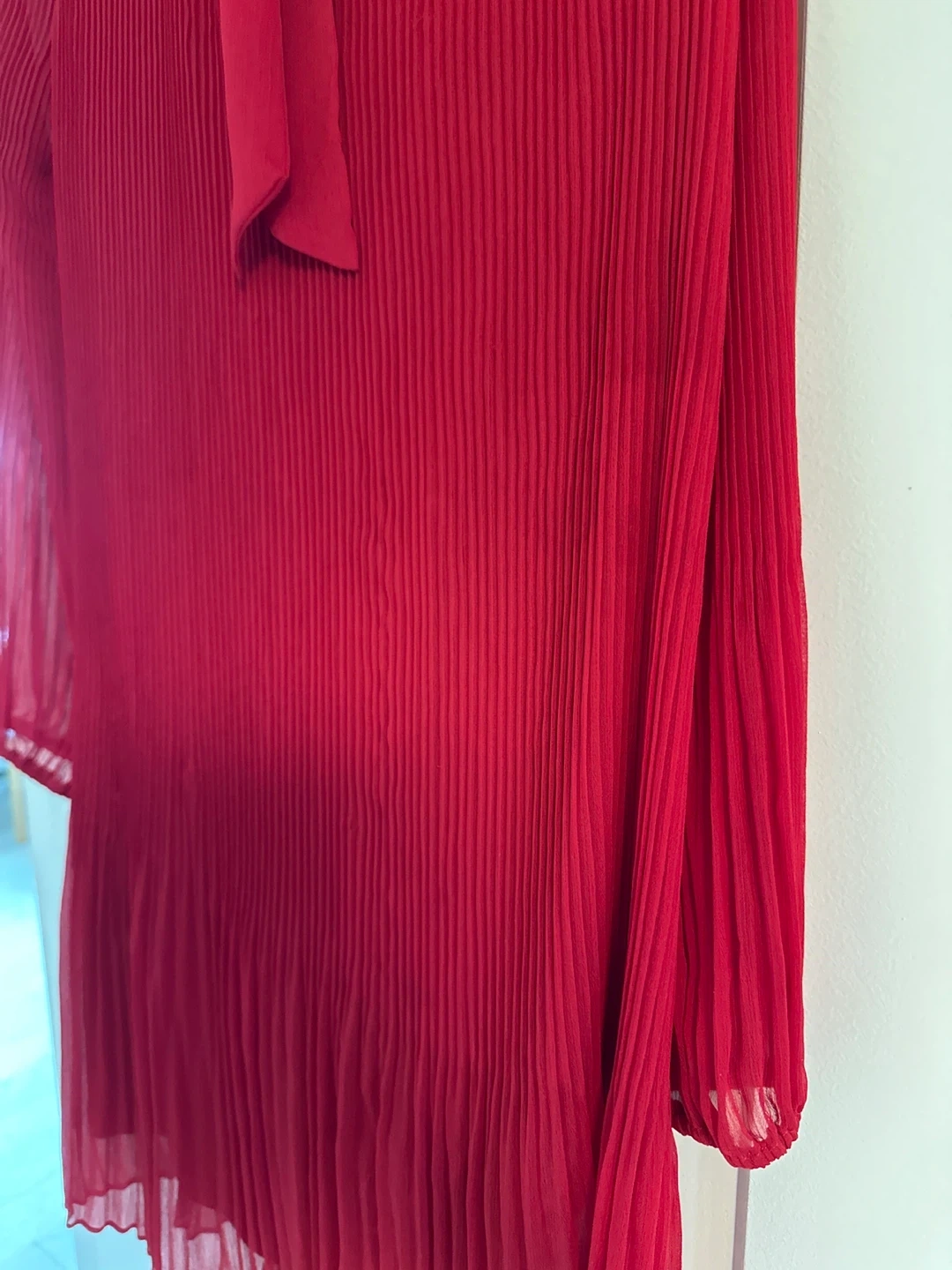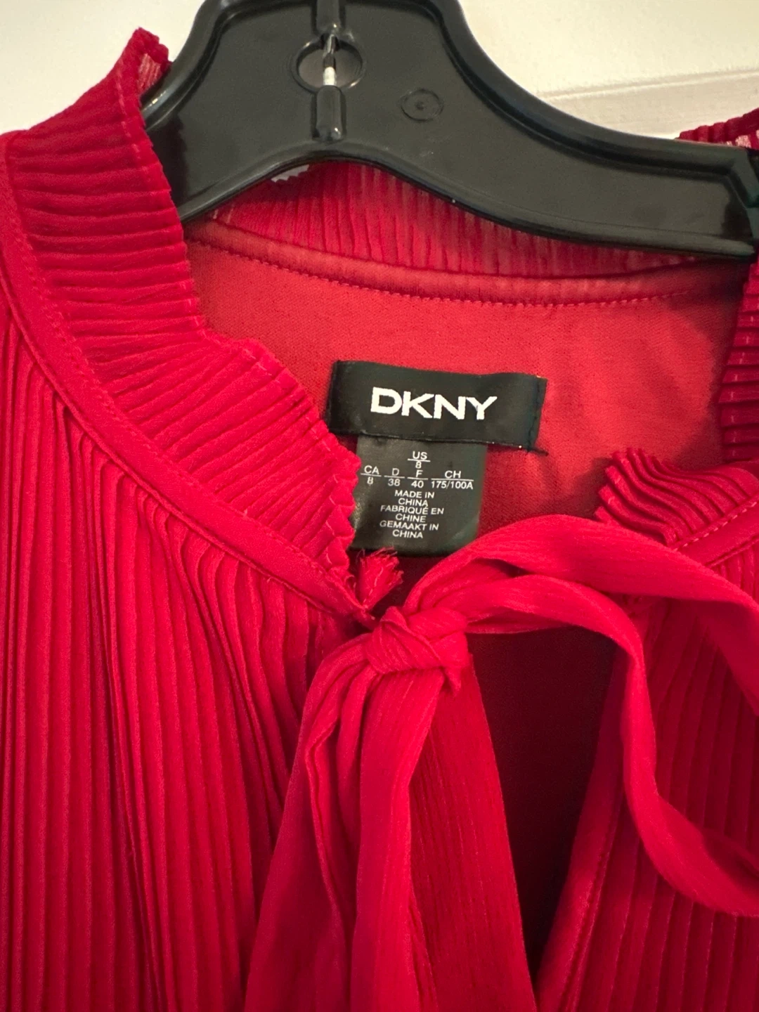 This DKNY dress is a vibrant red with stylish pleats all over. It features long sleeves and a fashionable bow tie at the neck. Made from lightweight chiffon material, it's perfect for a night out!