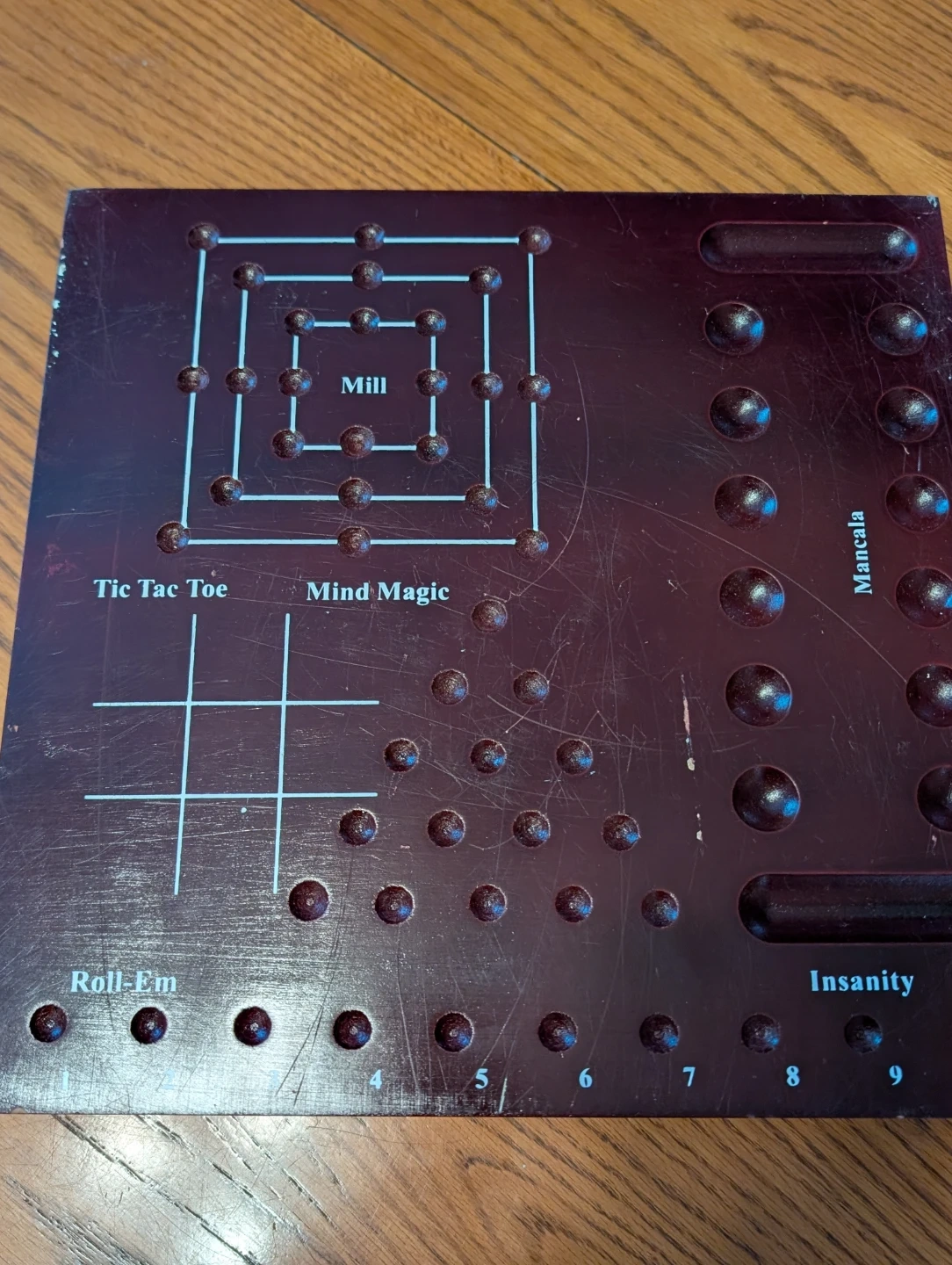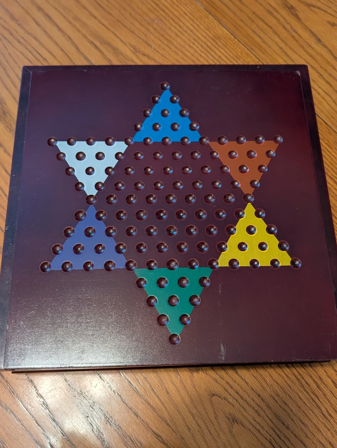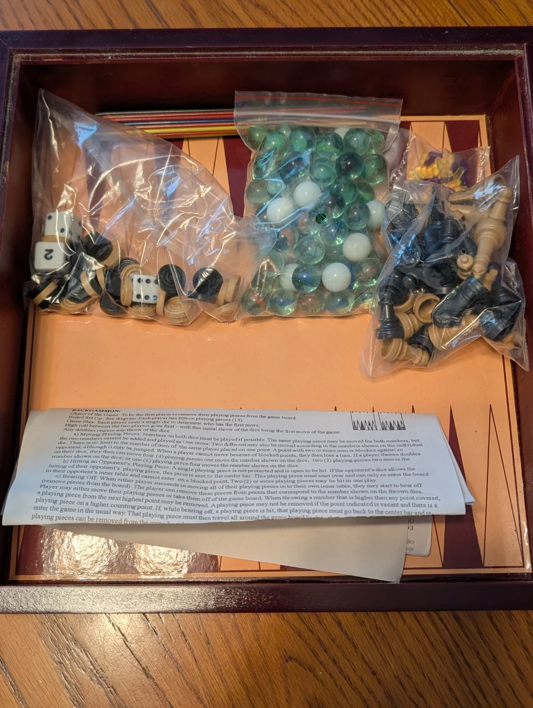 This wooden game board offers three classic games: chess, checkers, and Chinese checkers. It includes all the marbles and pieces needed for Chinese checkers, along with dice and checker pieces. The board measures approximately 14 inches square.
