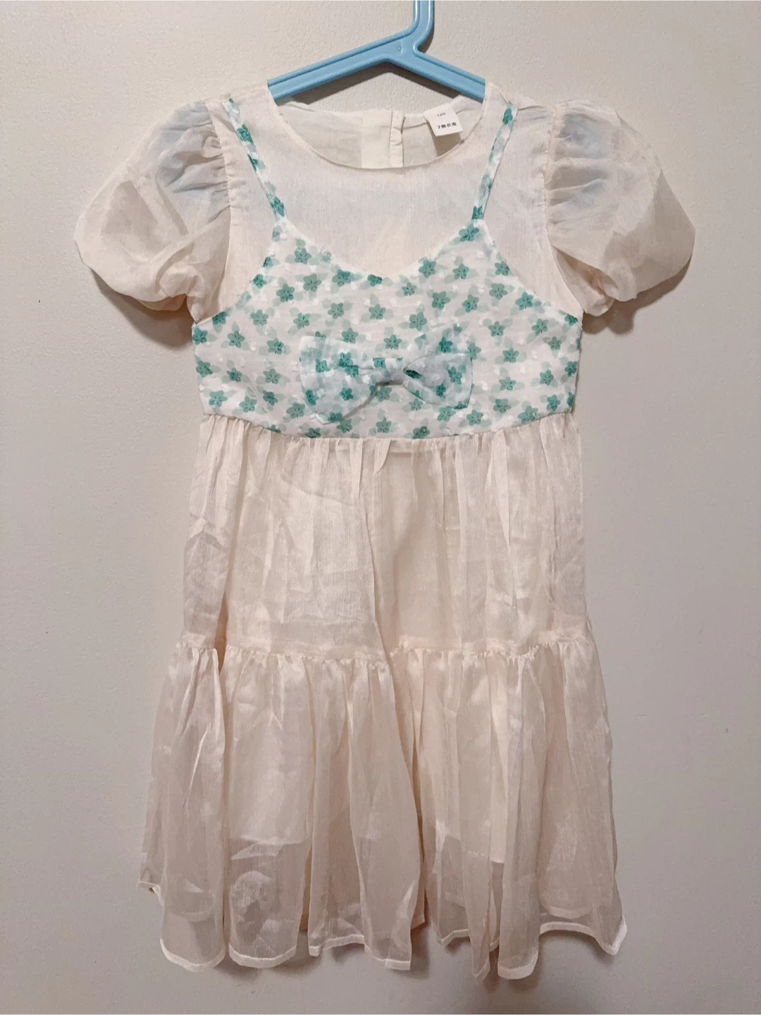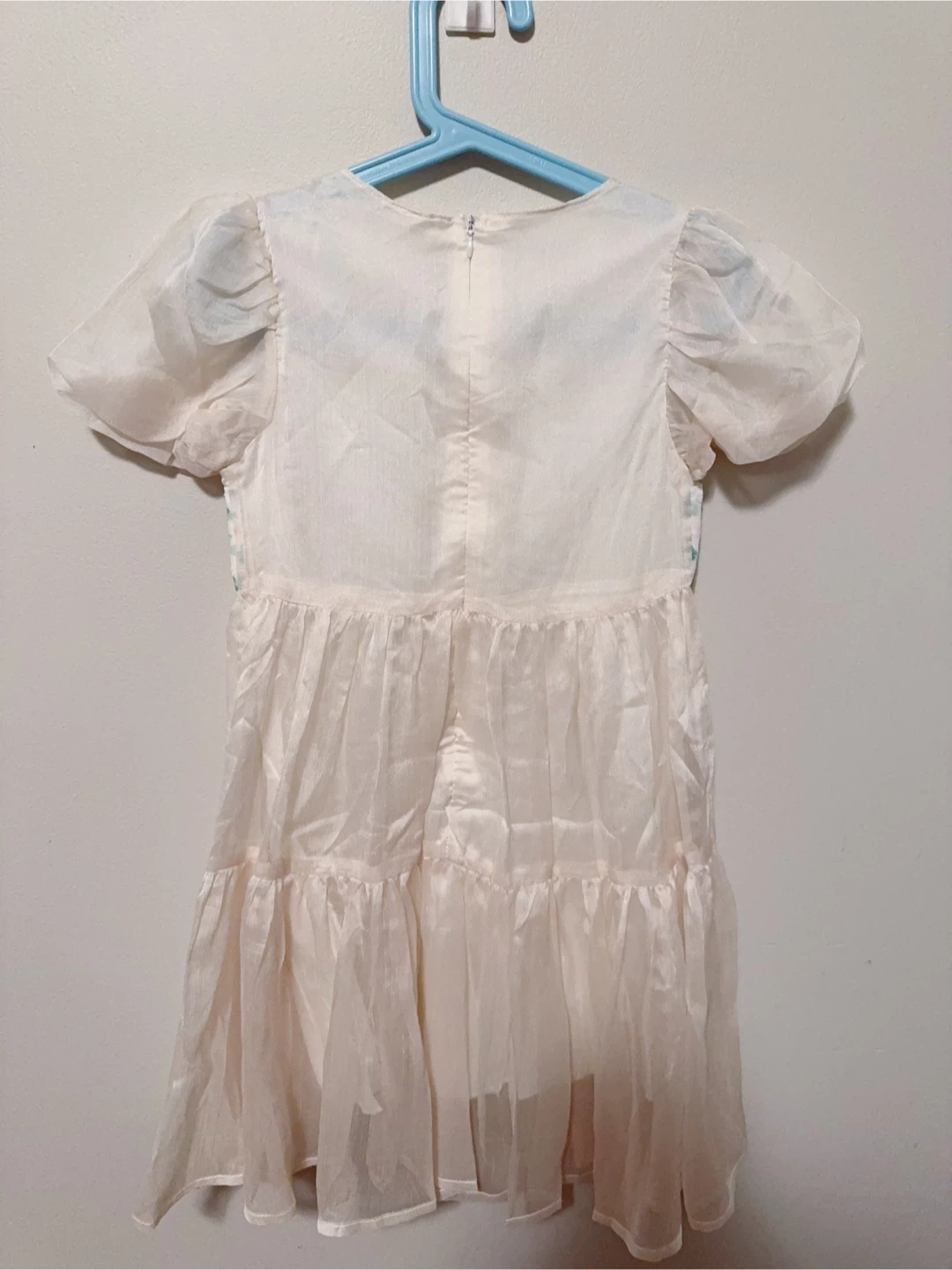A sweet cream dress with a floral print bodice. It has puffed sleeves and a tiered ruffled skirt. Made with lightweight sheer fabric and 100% cotton inner layer