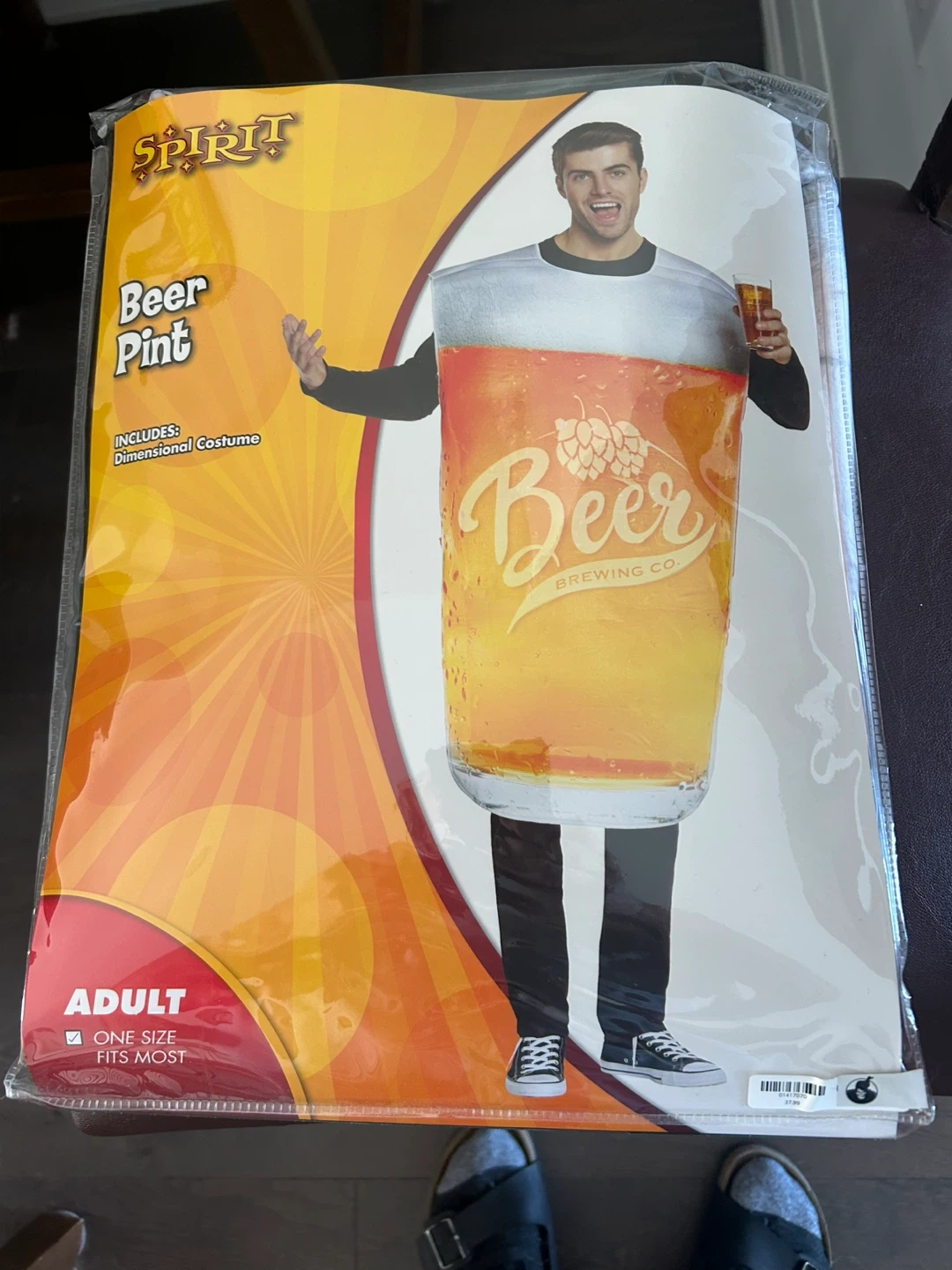 This Spirit Halloween Beer Pint dimensional costume is for adults. It's a one-size-fits-most costume. This costume is great for Halloween parties!