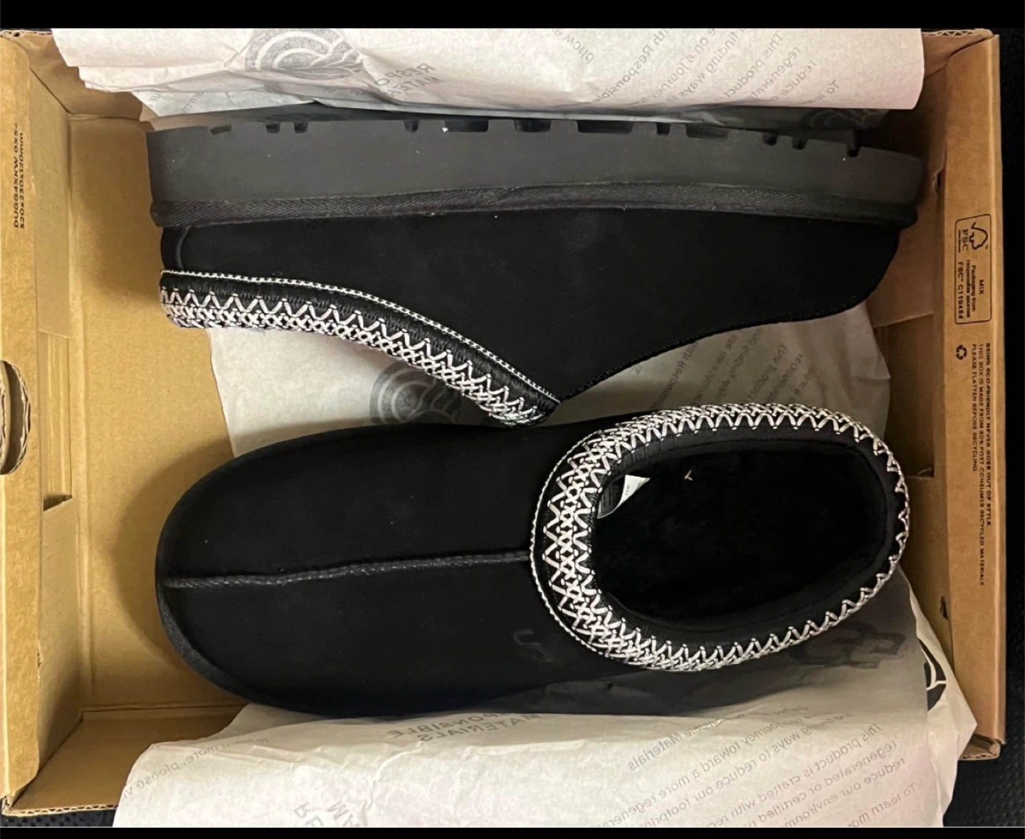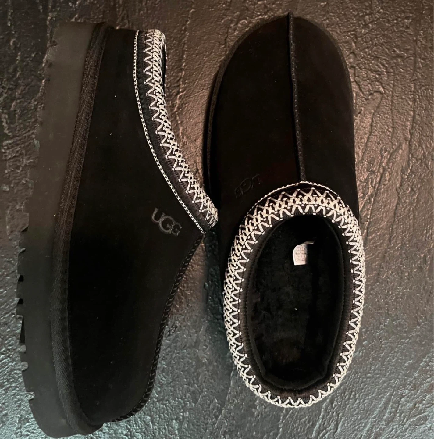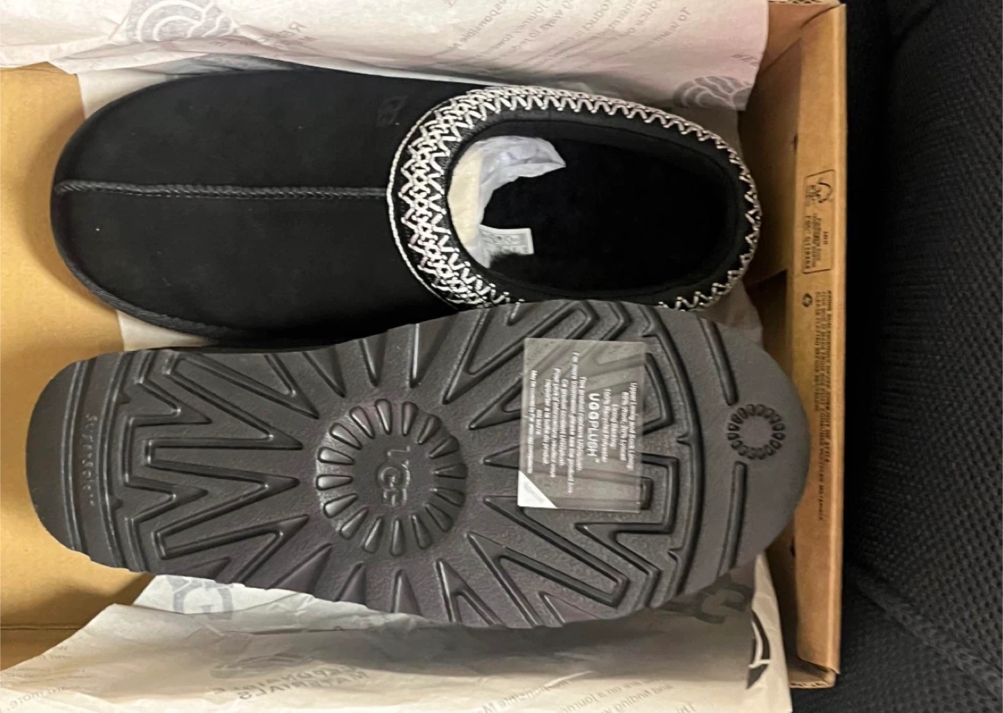 Cozy UGG slippers in black suede. Features a warm shearling lining and a durable rubber sole. Comes with original box.