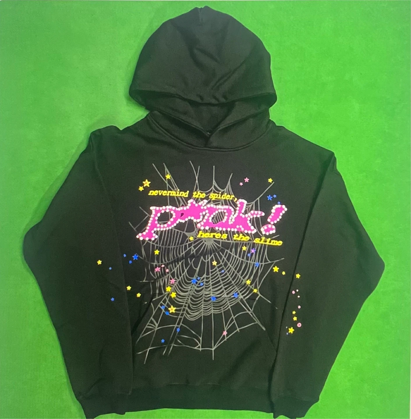 Black hoodie with a graphic of a spider web and stars. Features the text 'Nevermind the spider, Pink! Here's the slime'. Material is likely a cotton blend.(Its a good rep)