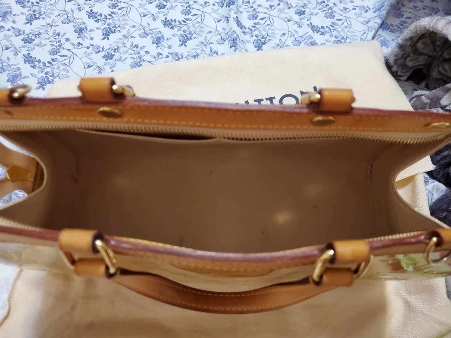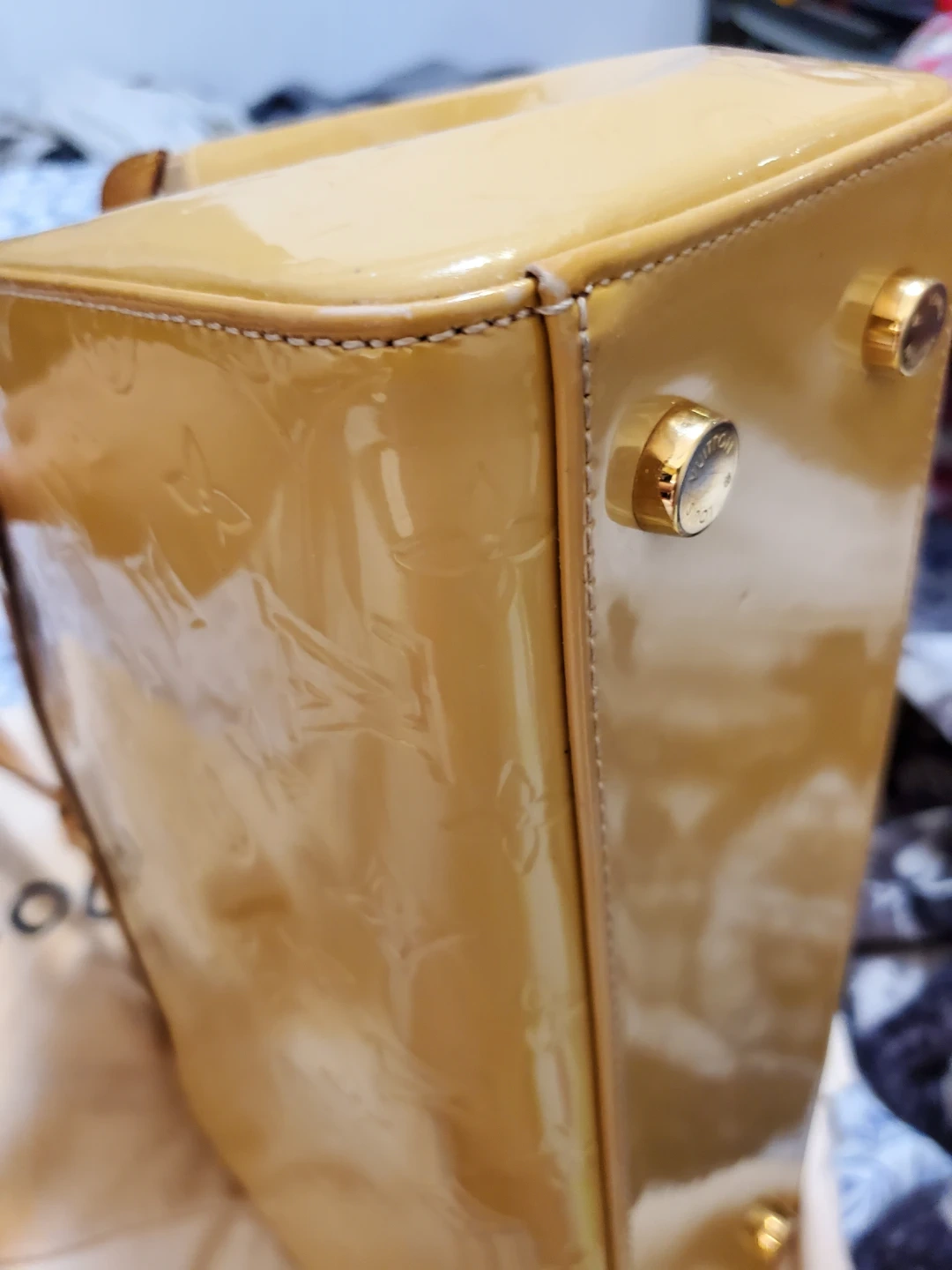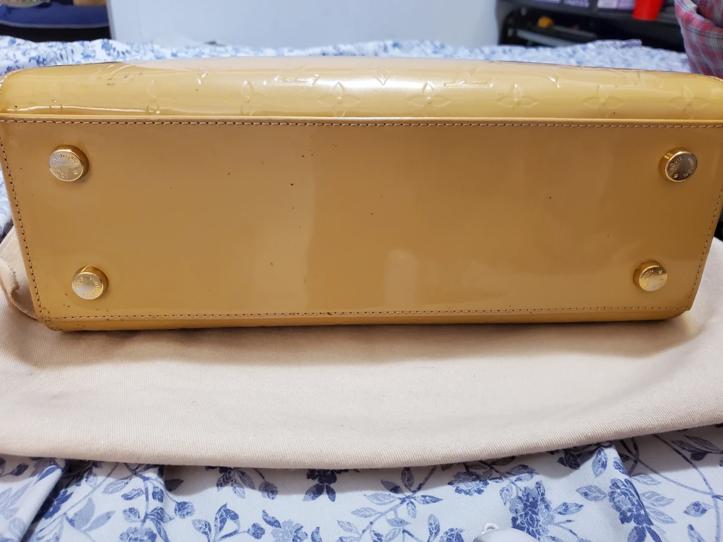 This is a Louis Vuitton Vernis handbag in a light yellow/beige colour. It has a patent leather exterior with the signature LV monogram pattern. The bag features dual top handles and gold-tone hardware. Interior is a neutral beige lining. It's a stylish accessory for everyday use.