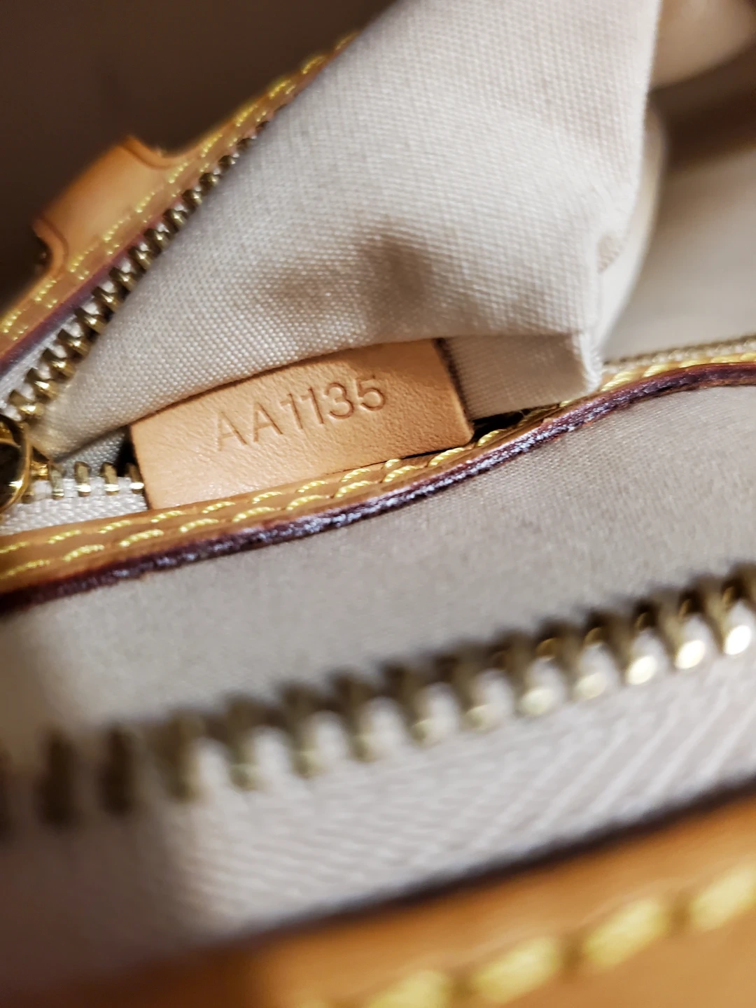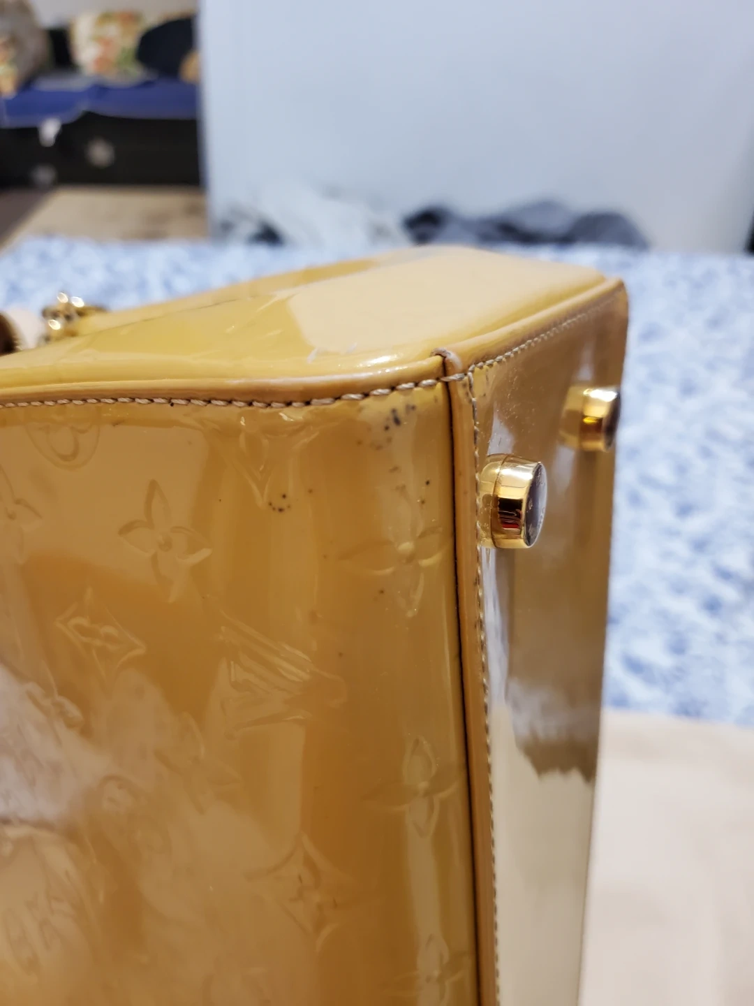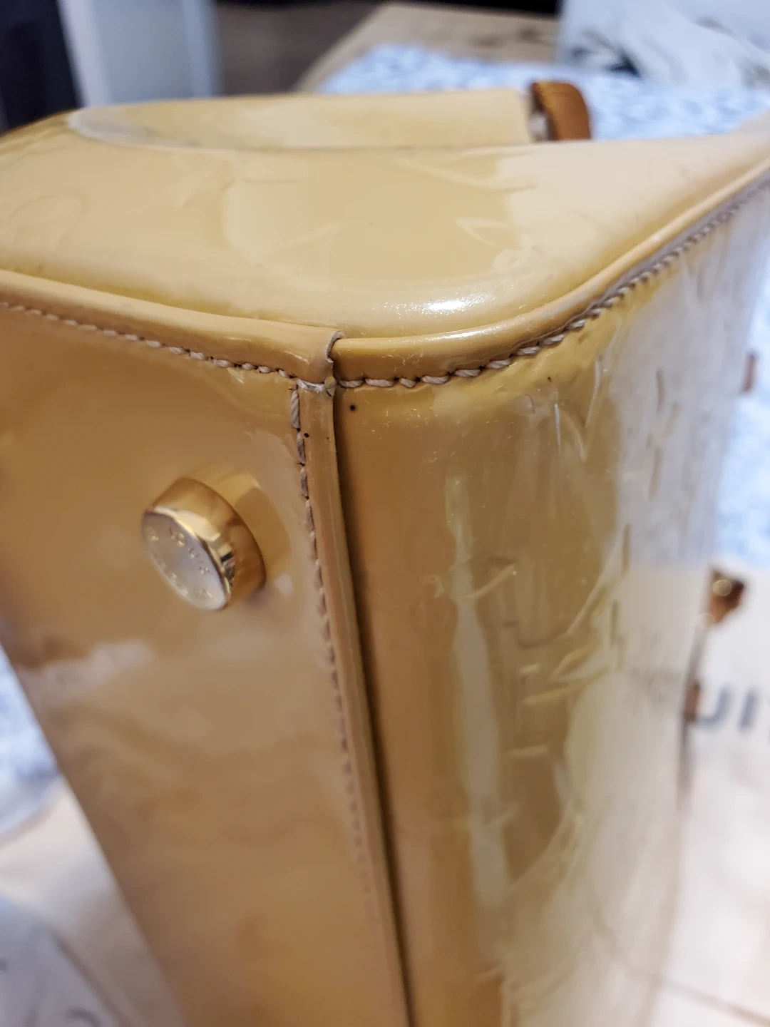 This is a Louis Vuitton Vernis handbag in a light yellow/beige colour. It has a patent leather exterior with the signature LV monogram pattern. The bag features dual top handles and gold-tone hardware. Interior is a neutral beige lining. It's a stylish accessory for everyday use.