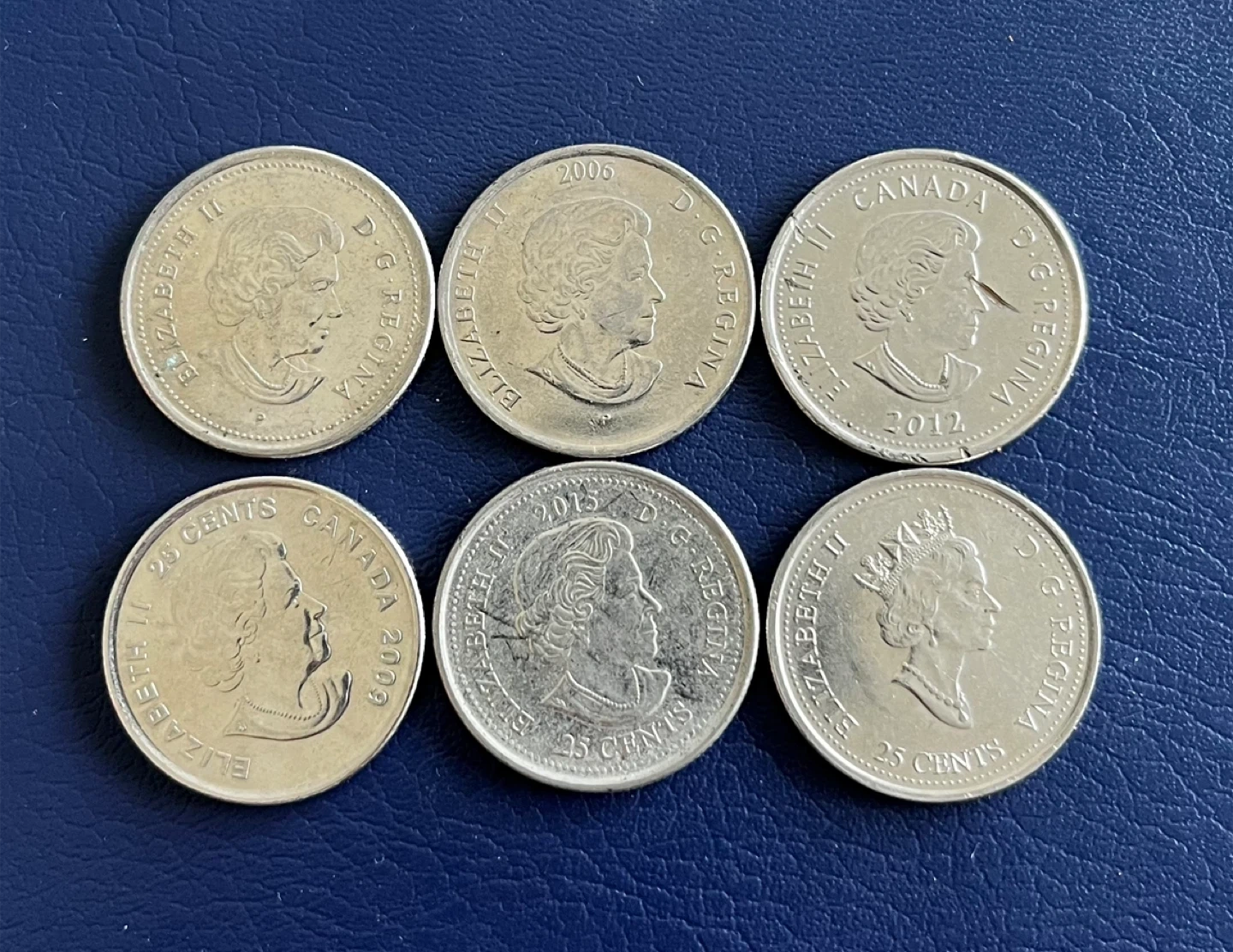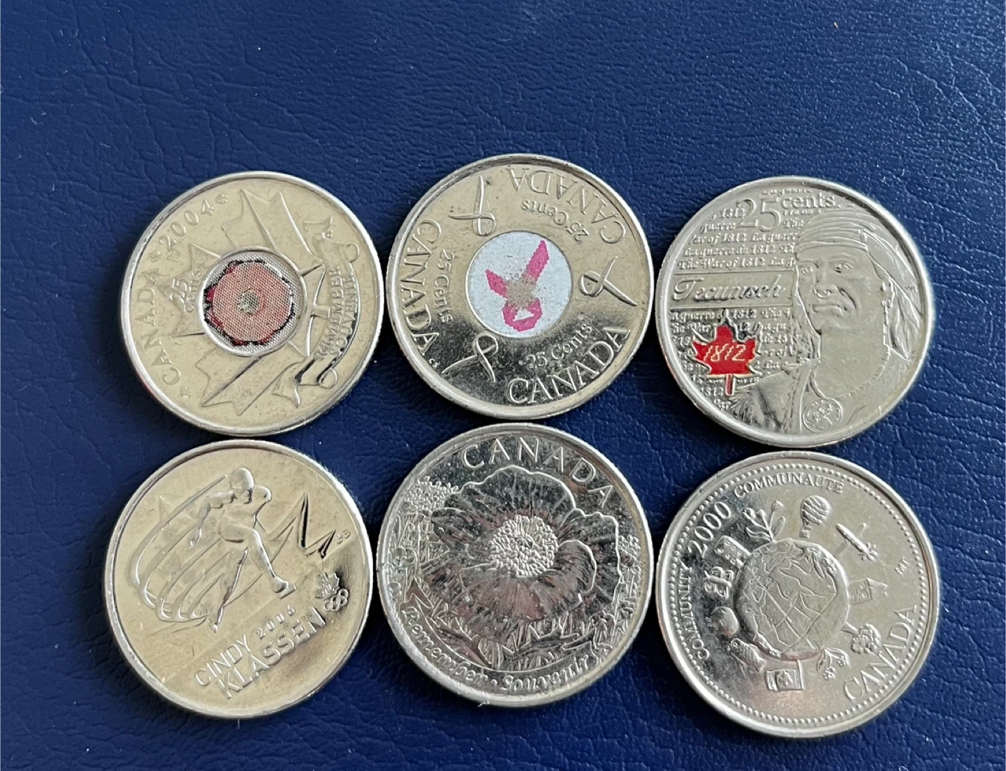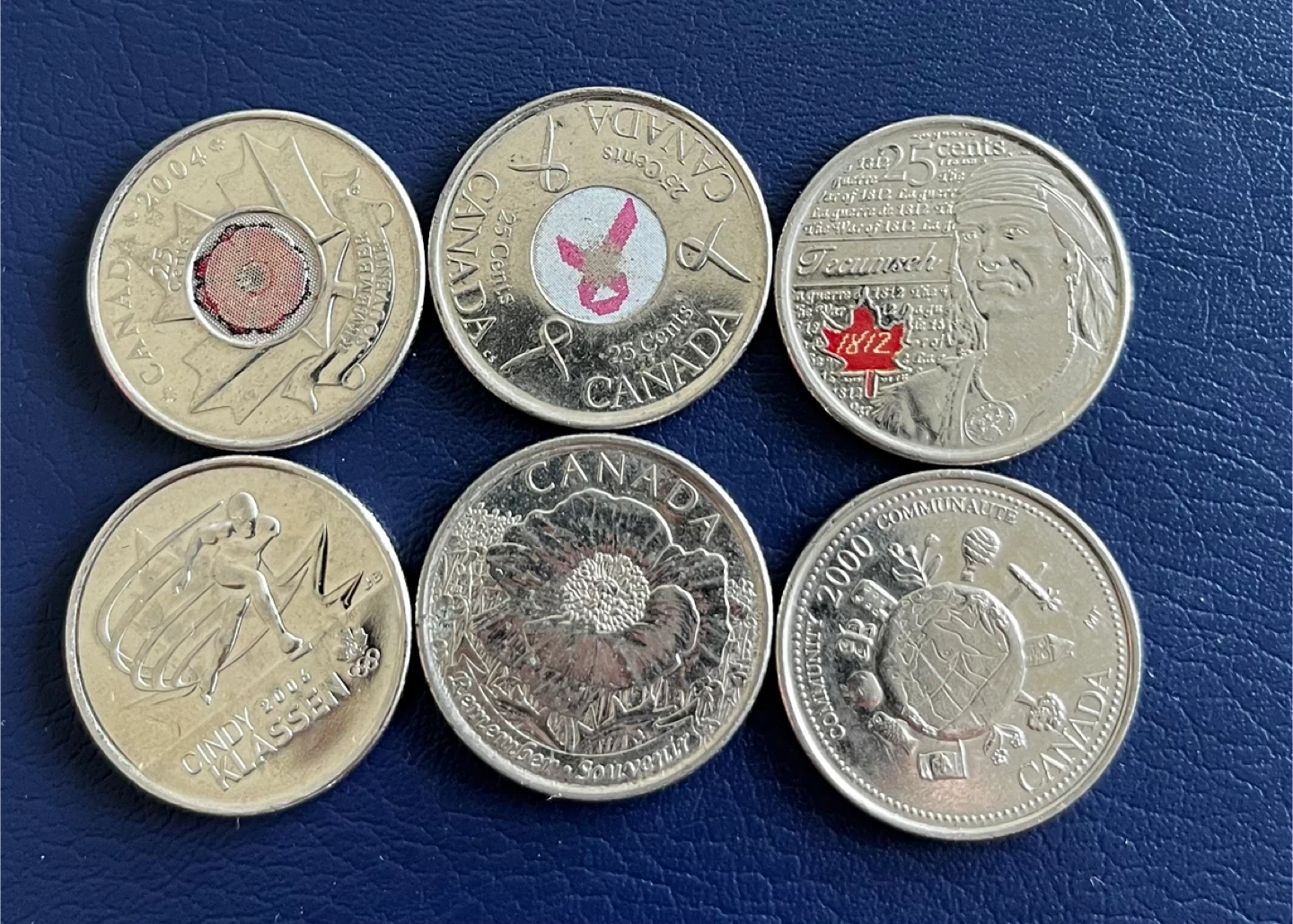 Colour and design Includes various Canadian quarters from different years and designs. Some coins feature special commemorations. These are standard 25 cent denominations.