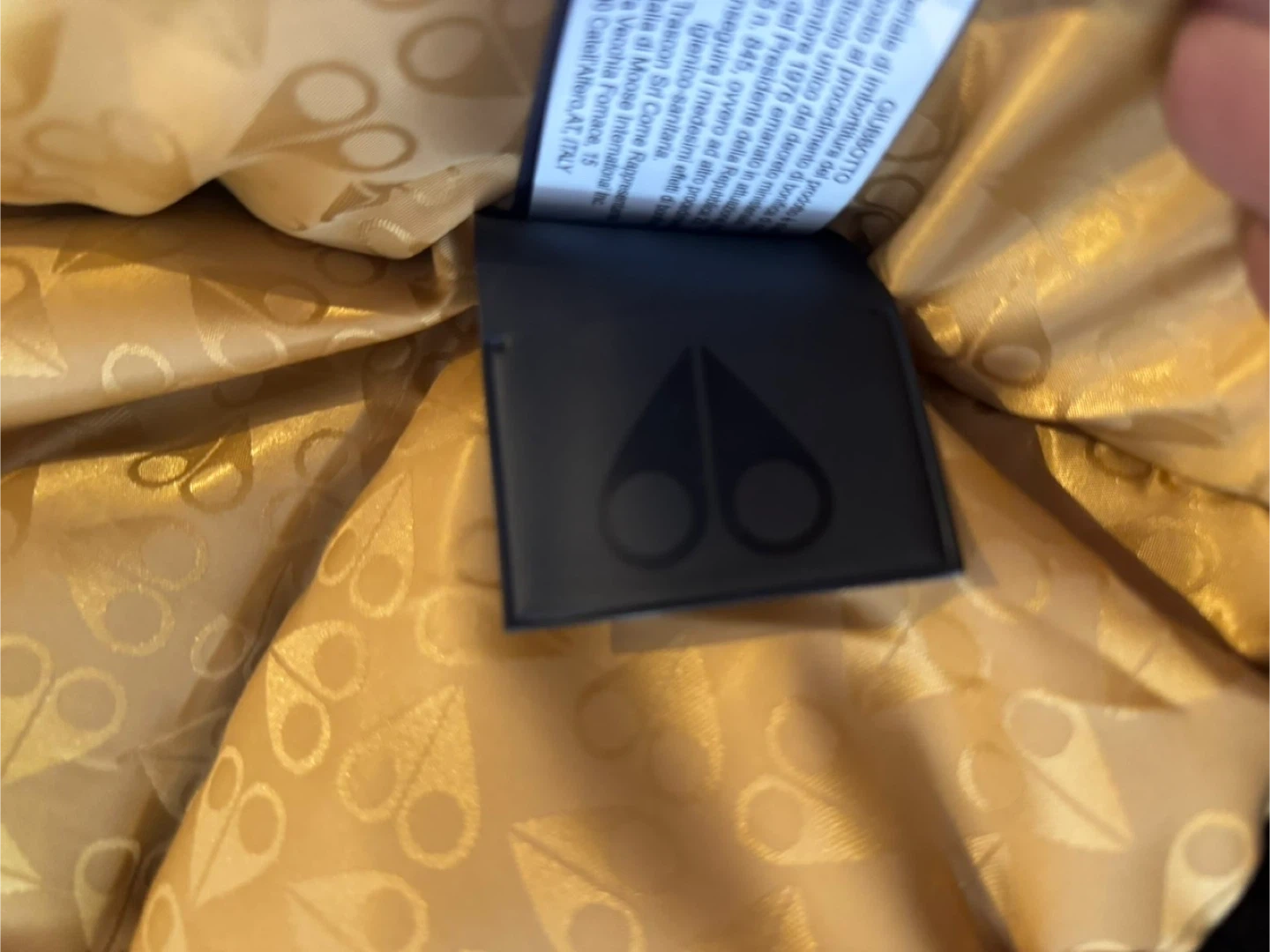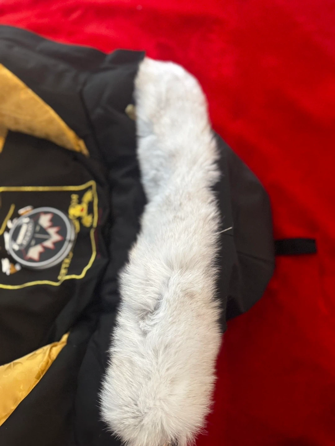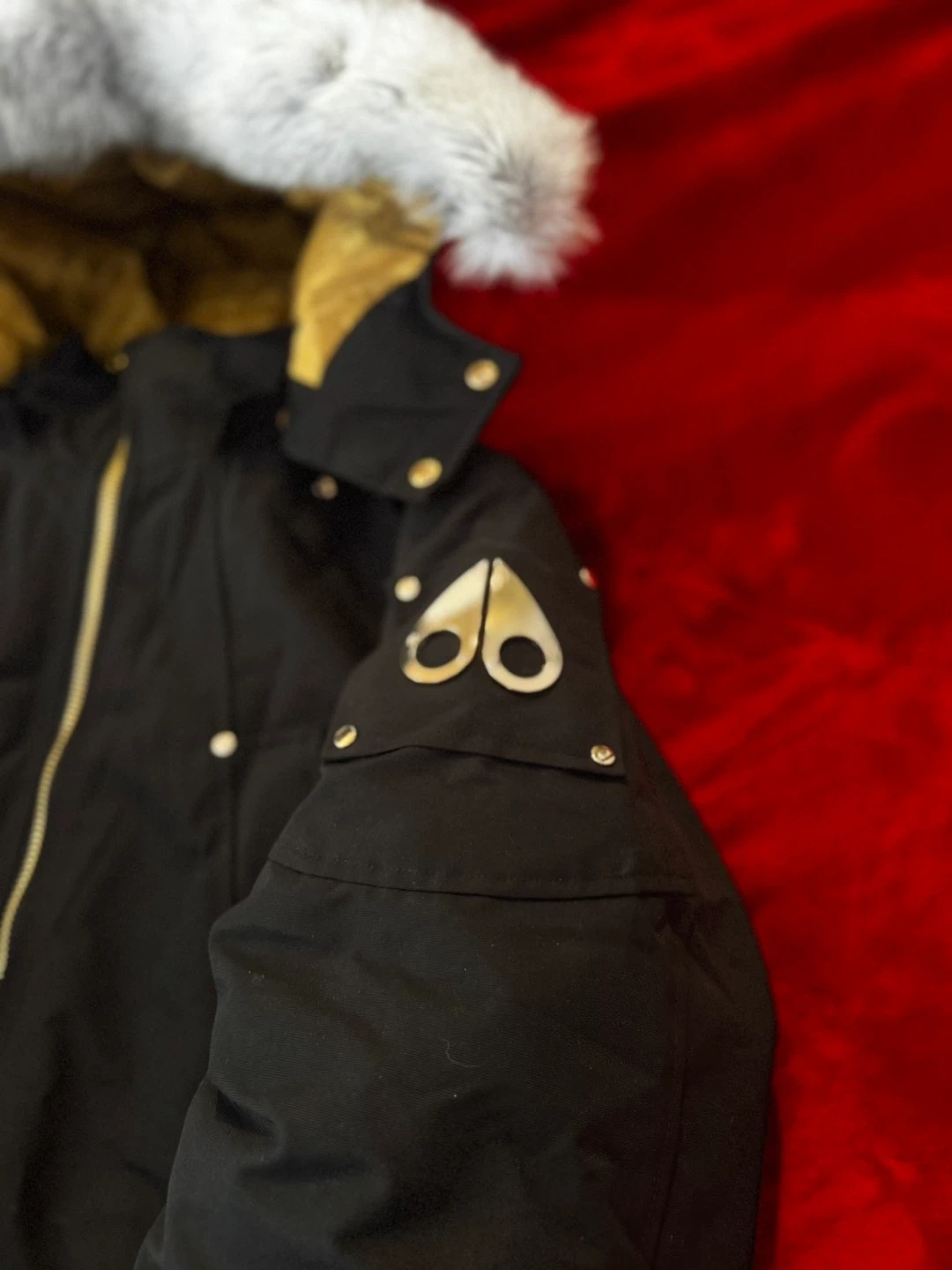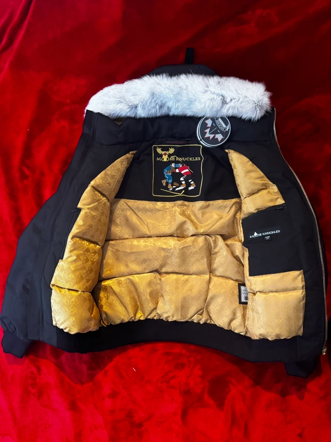 Black Moose Knuckles puffer parka jacket with a fur-lined hood. It has a gold patterned interior lining. This jacket is warm and stylish for colder weather.o